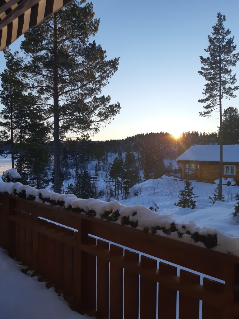 So setzte ich meinen Spaziergang fort, entdeckte neue Wege, die ich allerdings noch nicht weiter erforschen wollte, da sie mich zu weit entfernten. Immerhin wollte ich rechtzeitig bei meinen Freunden sein! So kam ich glücklich gefüllt mit neuen Eindrücken, vor allem inneren Erlebnissen, zurück. Ich hatte noch Zeit, Kaminholz im Wohnzimmer anchzufüllen und bald waren die Freunde auch auf den Beinen. Immer weiter stieg die Sonne, bis sie gegen Mittag die Weite des Sees erreichte und ihn mehr und mehr erhellte. Wir hatten ein genüssliches Brunch, bevor ich in das Würfelspiel “Yatzy” eingeführt wurde. Da verging die Zeit viel zu schnell! Ich wollte mit dem Bus nachhause fahren, doch meine Freunde winkten ab: sie bestanden darauf, mich bis vor die Tür zu bringen! – Welch spezielles Wochenende – “Tusen hjertelig takk” – herzlichen Dank!