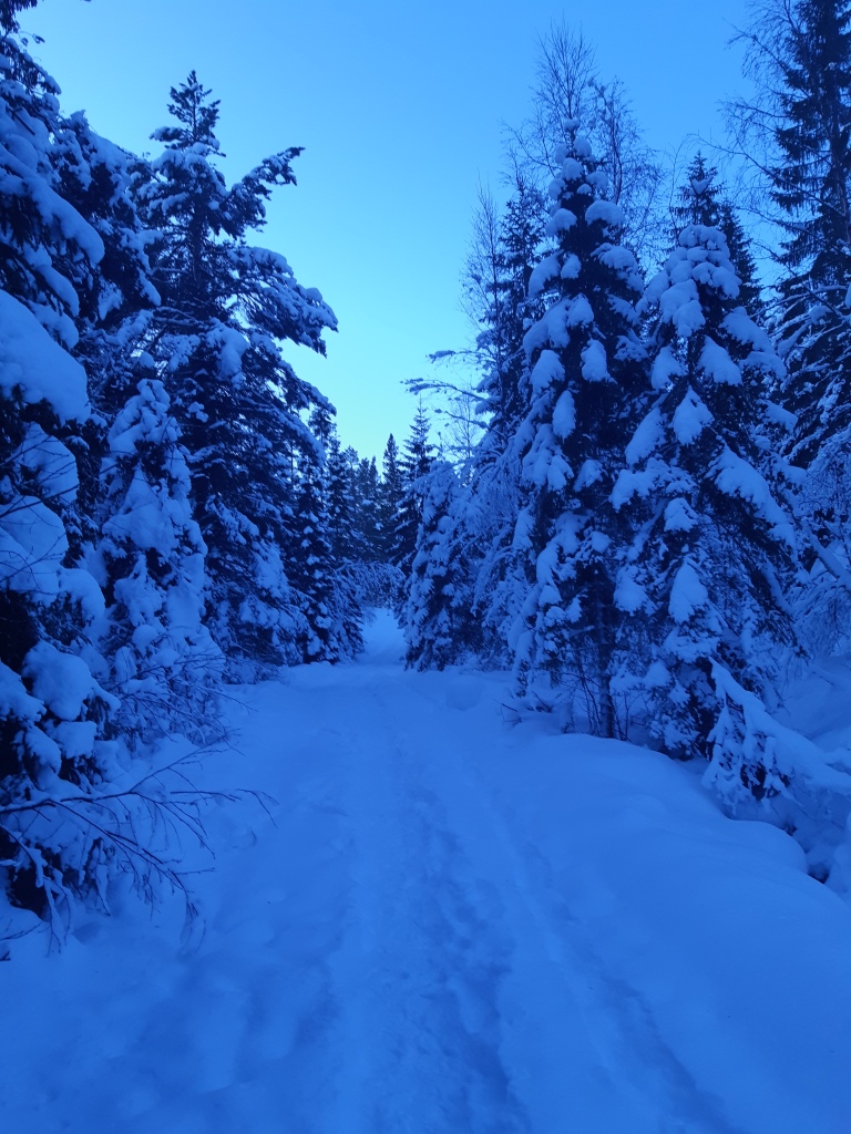 Es war kalt und windig draussen. Doch diese klare Luft, mit diesem Blau in der Atmosphære ist etwas ganz Spezielles für Nowegen- wahrscheinlich aber für das gesamte nördliche Skandinavien. Nach wenigen Schritten fiel der Weg ab zu einem See. Dieser war nun einfach eine riesige weisse Fläche- gefroren und von Schnee bedeckt. Es war verlockend, auf ihm zu gehen. Gleichzeitig war ich bewusst, dass das Eis nicht tragend genug war, da die Tage zuvor das Thermometer um die null Grad gelegen hatte. Aber ich fand einen schönen Zugang zum See und war durch eine ausgelegte Brücke “auf ihm” oder besser: “über ihm”. Diese Ruhe, diese Stille, selbst den Wind spürte man hier nicht…es dunkelte zusehends -somit wurde das Licht bläulicher… eine merkwürdige Stimmung! Langsam ging ich zurück. Ich wählte einen kleinen Umweg, um auch die umliegenden Häsuer zu betrachten. Jedes hatte seine eigene Bauart, alle aus Holz, jedes war der individuelle Ausdruck seiner Bewohner. Eines hatten sie gemeinsam: sie wirkten einladend und gemütlich! Ich kam auch an einem Waldstück vorbei: tief verschneite Nadelbäume standen Spalier für einen nun ganz verschneiten Pfad. Dieser wirkte wie der Weg in ein Traumland. – Am nächsten Morgen würde ich meine Erkundigungen ausweiten – nun musste ich zu den Freunden zurück!