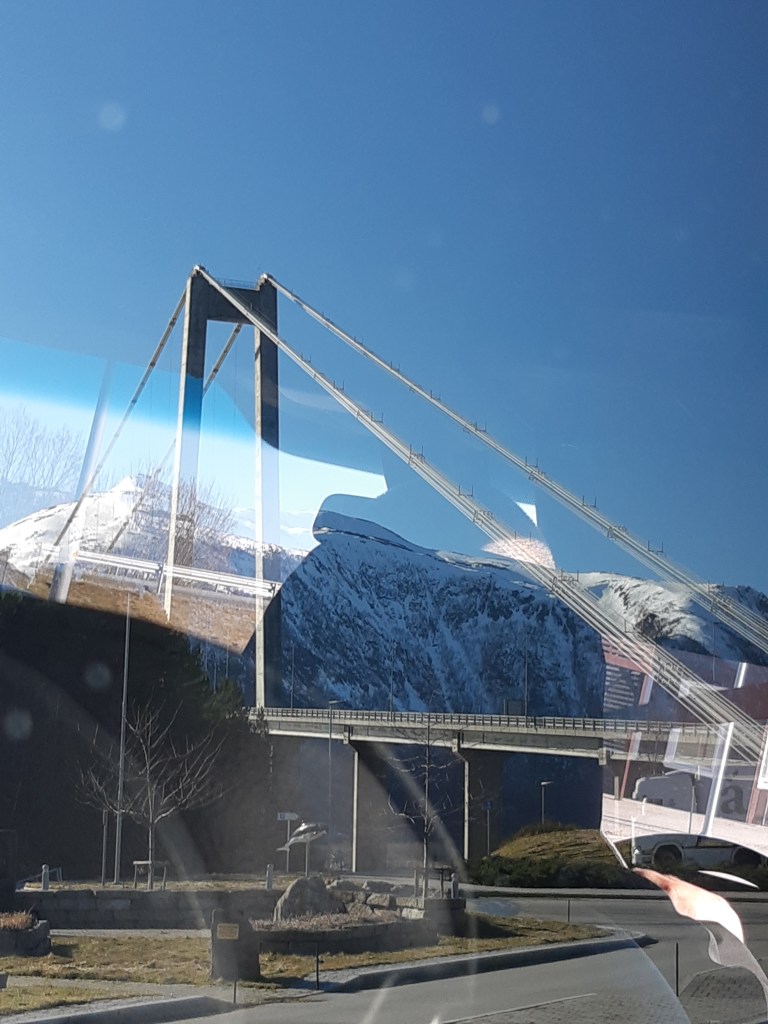 In der Tat kamen wir aus dem Schauen und Staunen nicht heraus! Herrliche Landschaften, teilweise noch im Winterkleid, teilweise bereits im ersten Frühling zogen an uns vorbei – oder vielmehr wir an ihnen. Dann war eine Haltestelle eine Fæhreanlegestelle. Ich dachte mir nichts dabei. Doch halt! Unser Bus fuhr auf diese Fæhre! Auch das noch! Toll!