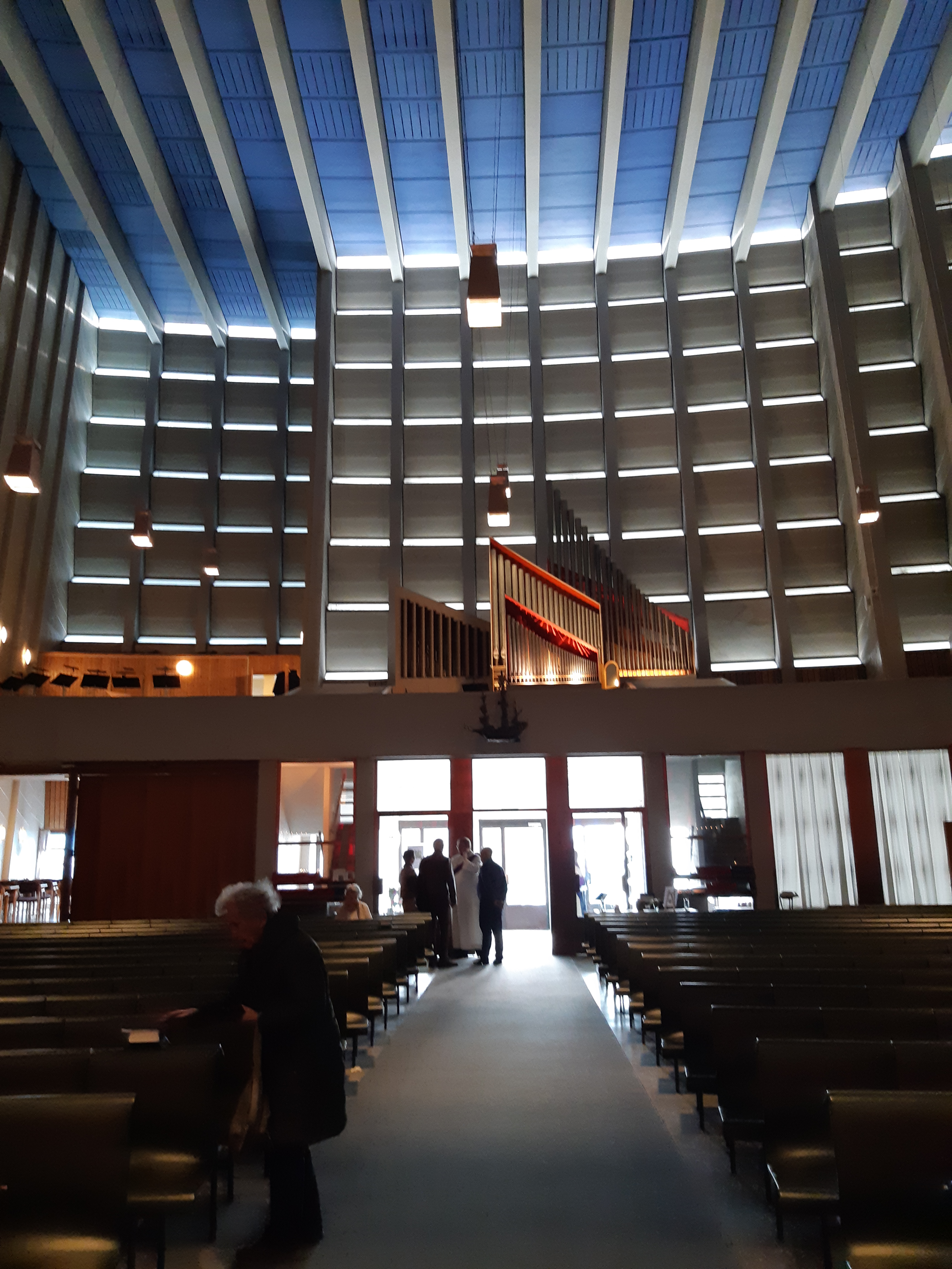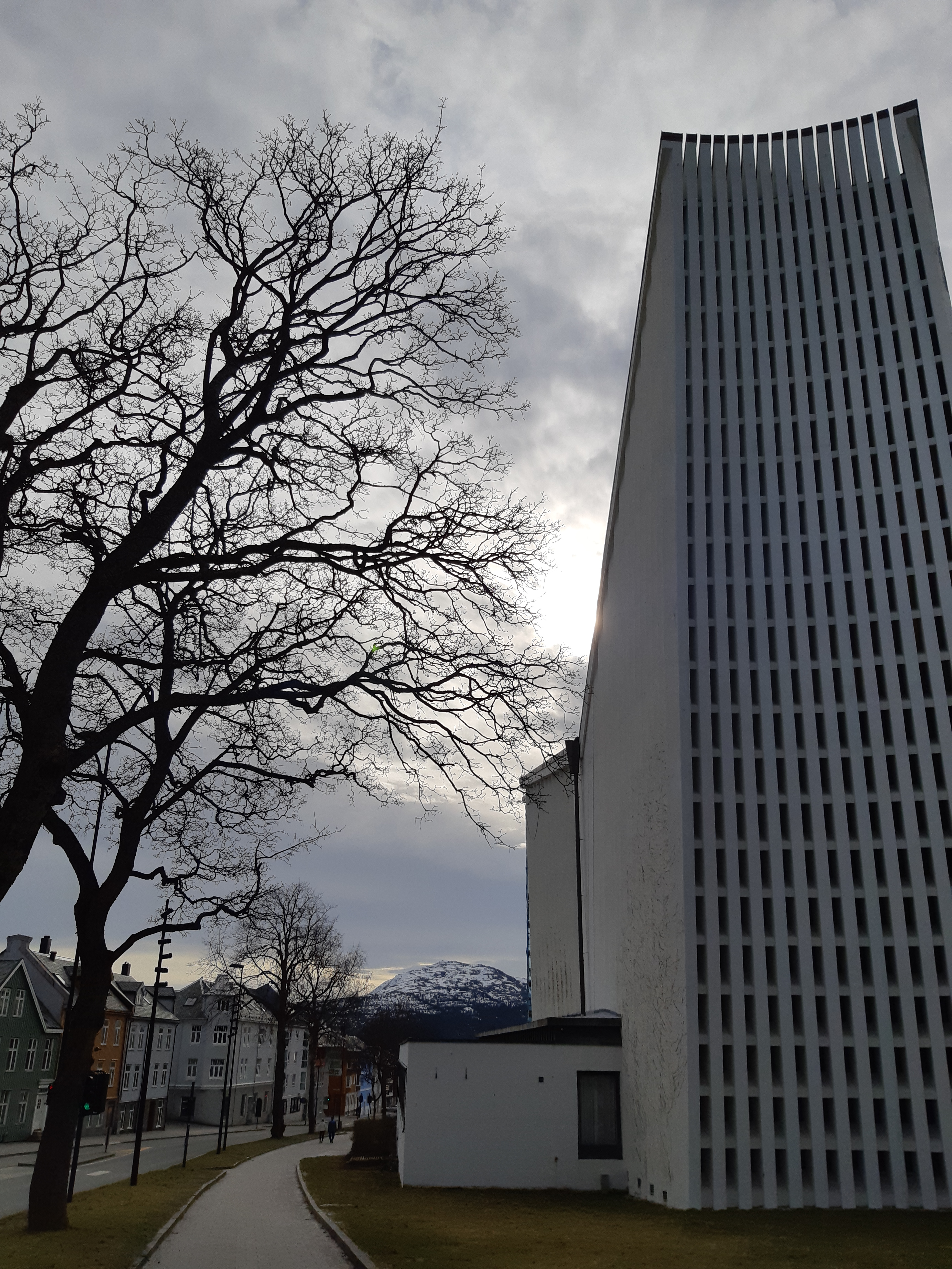 Sonntag Morgen… nun hatte ich den gesamten Tag, um møglichst viel zu sehen – zu Fuß! Nach einem mæßigen Frühstück, einem selbst vorbereiteten Picknick, zogen wir, Spassvogel und ich, los. “Ei bin ich noch müde!” gæhnte mein Rabe und streckte sich. “Ja, ich glaube es dir! Der Anreisetag mit den vielen Eindrücken… Aber du wirst sehen, gleich wird es heute so interessant, das der Schlaf wie weggeblasen ist!” Mein Rabe sah mich umglæubig an… Zunæchst dahen wir ein schønes Gebæude im nordischen Jugendstil: die Oper. Nahe daran liegt ein Park, in dem ein Erinnerungsstein an den Besuch der norwegischen Kønige erinnert. In der Ferne hørte Kirchenglocken. Sie læuteten zum Gottesdienst. Doch ich hatte es nicht eilig, ich wollte die Stadt erkunden. Aber justament führte mich der Weg an der Kirche vorbei: Kirkeland Kirke, heißt sie. Ein ungewøhnlicher, ich møchte fast sagen, hæßlicher Bau von außen. Mir tønte Kirchenmusik entgegen. Da mußte ich hinein gehen. Das Kircheinschiff ist riesig! Hinter dem Altar ist eine Fensterwand, die die gesamte Høhe des Turmes ausmacht! Betonstreben, die in geringen Abstænden den Plafond entlang ziehen. Das ergab ein ganz spezielles Licht! Ein Tenor sang ganz herrlich! Auch wenn die Messe nicht gut besucht war, es war eine erhebende Atmosphære, dabei zu dein! Hier ein paar Fotos von diesem ersten Teil des Tages. Fortsetzung folgt!