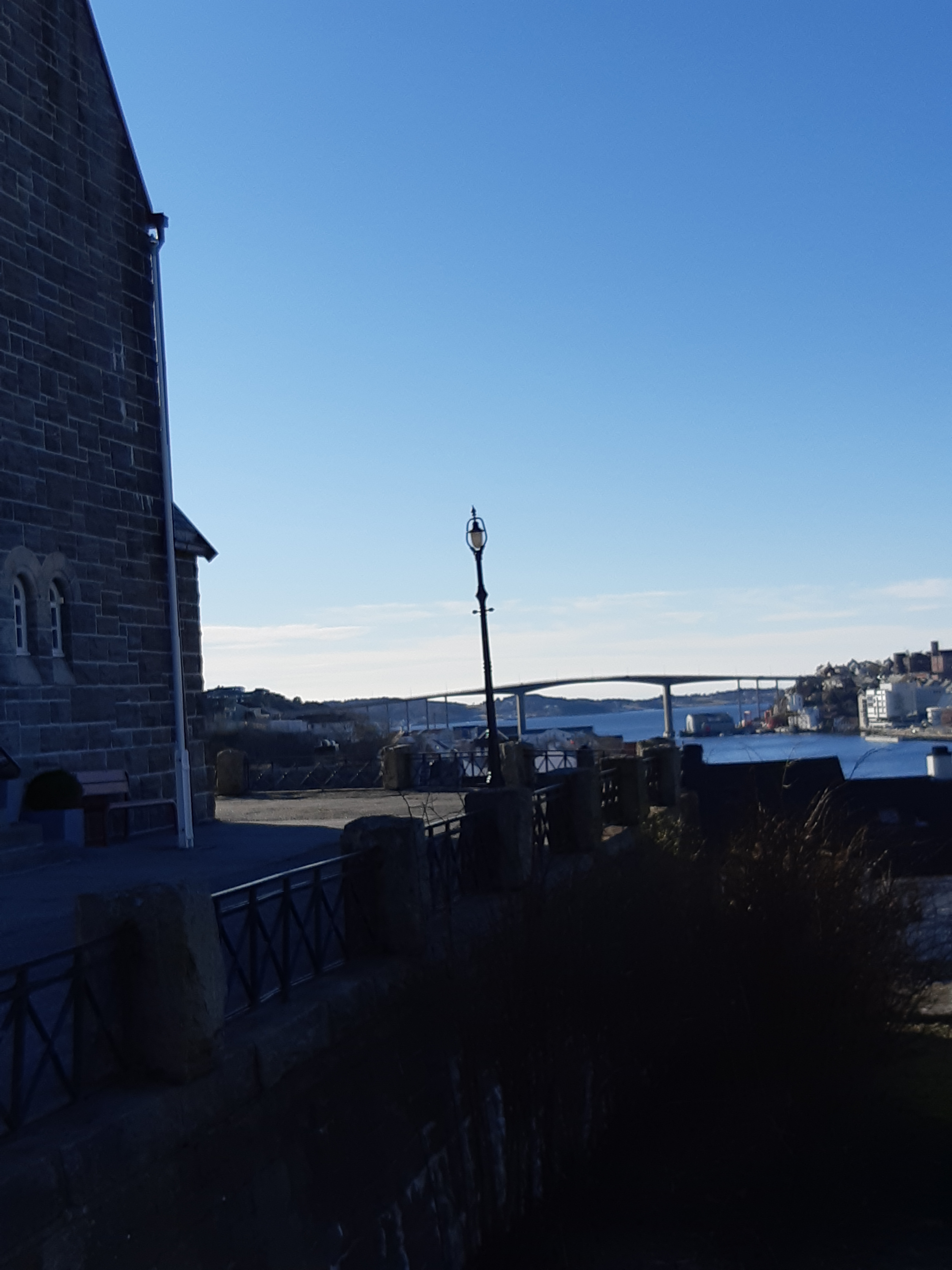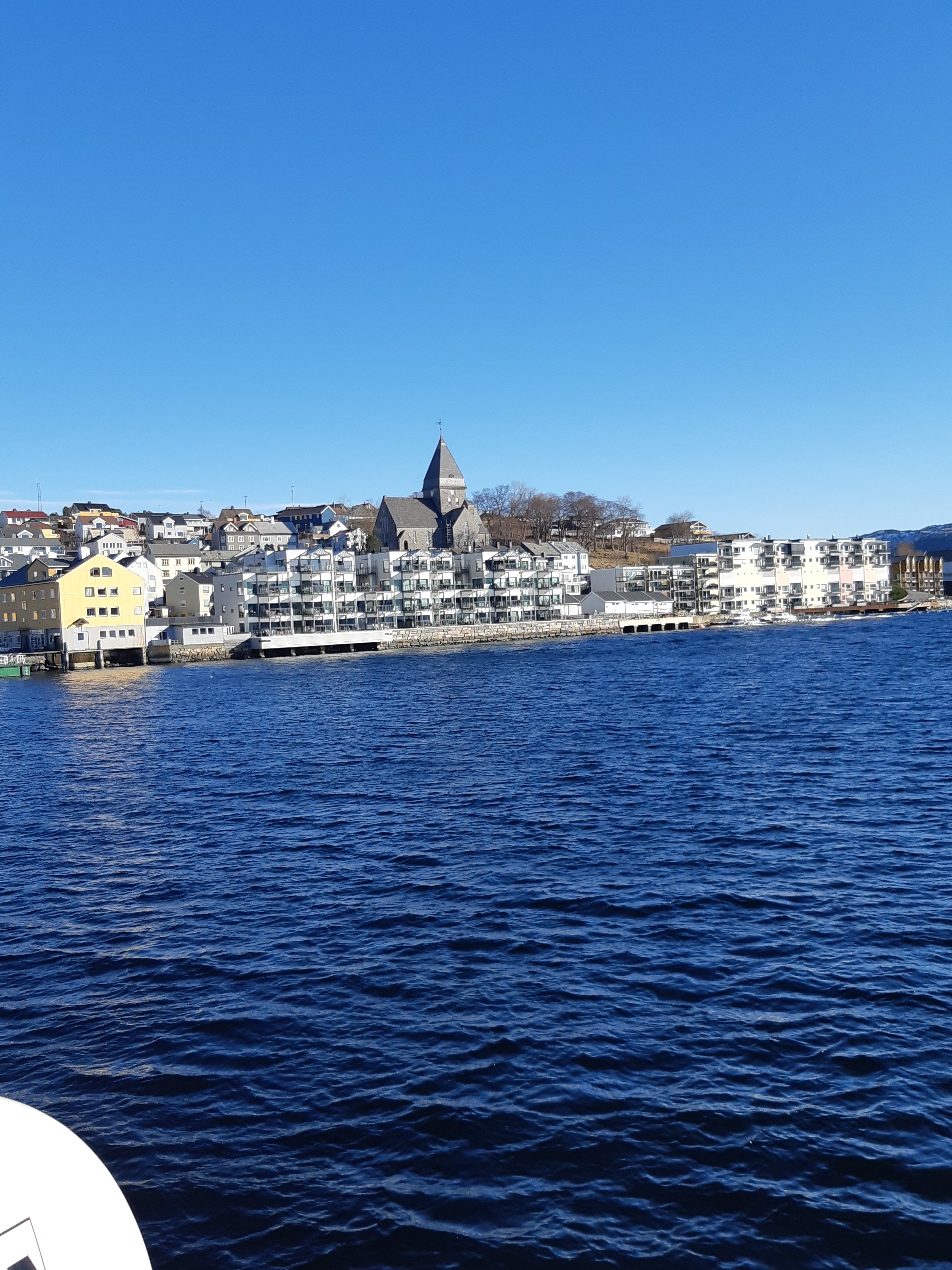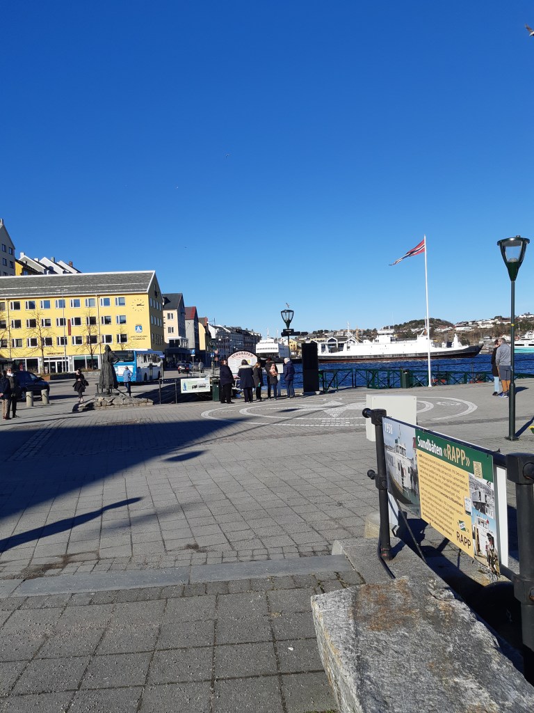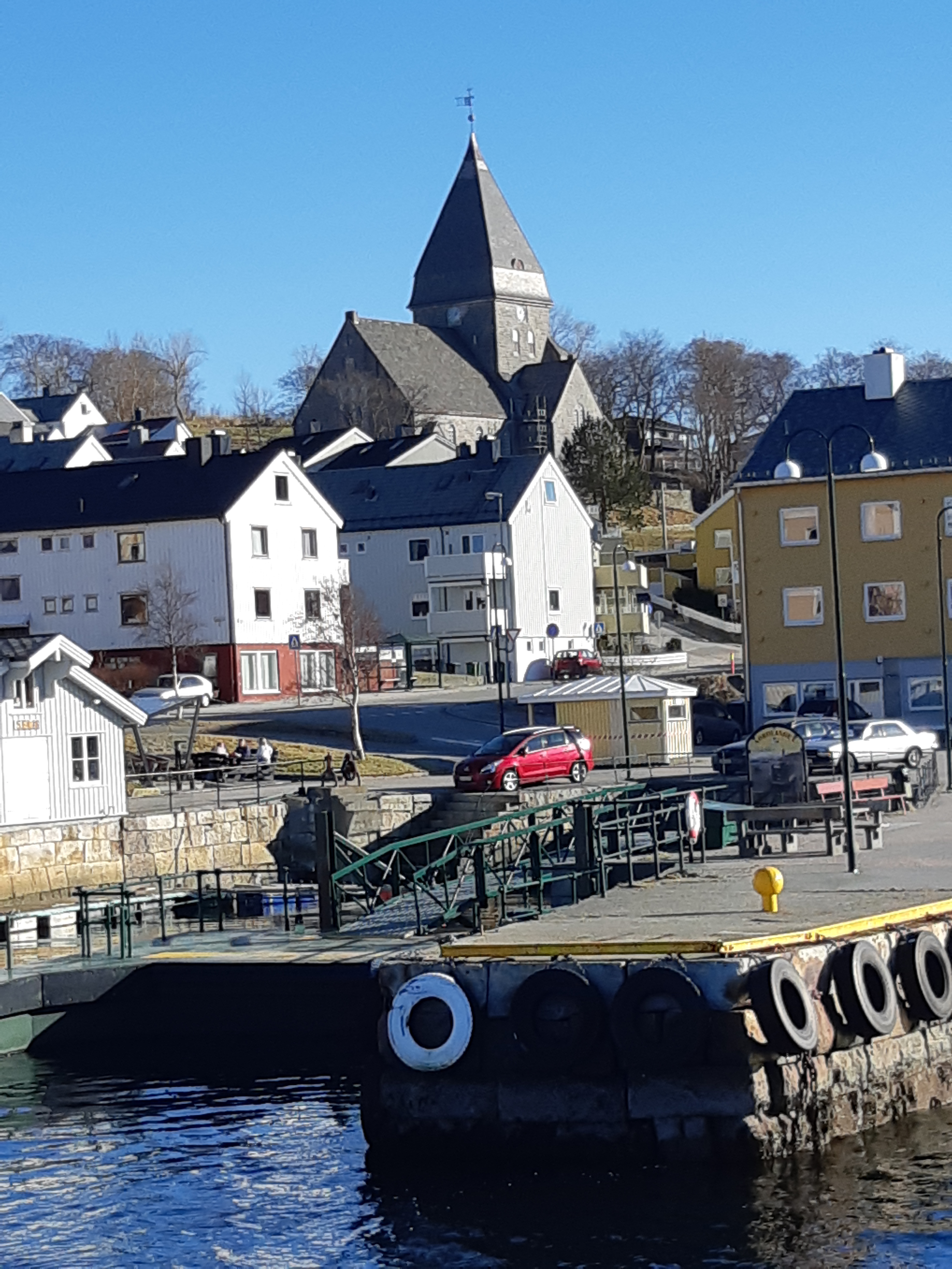 Bald legten wir auf der Nachbarinsel an.Leute kamen und gingen… Fa ksm schon fie næchste Insel. Ich fragte, ob ich an Land kønne, um danach wieder an Bord zu gehen. Es wurde gestattet. So konnte ich die angeblich ælteste Kirche, Beginn des 20. Jahrhunderts im nordischen Jugendstil erbaut, næher betrachten. Sie liegt auf einer Anhøhe, auf die nach norwegischer Art ein steiler dafür direkter Weg führt. Leider war sie verschlossen. Doch der Anhøhe folgend, kam ich zu einem Rastplatz mit herrlichem Blick! Am Weg grüßten mich die ersten Schneegløckchen…