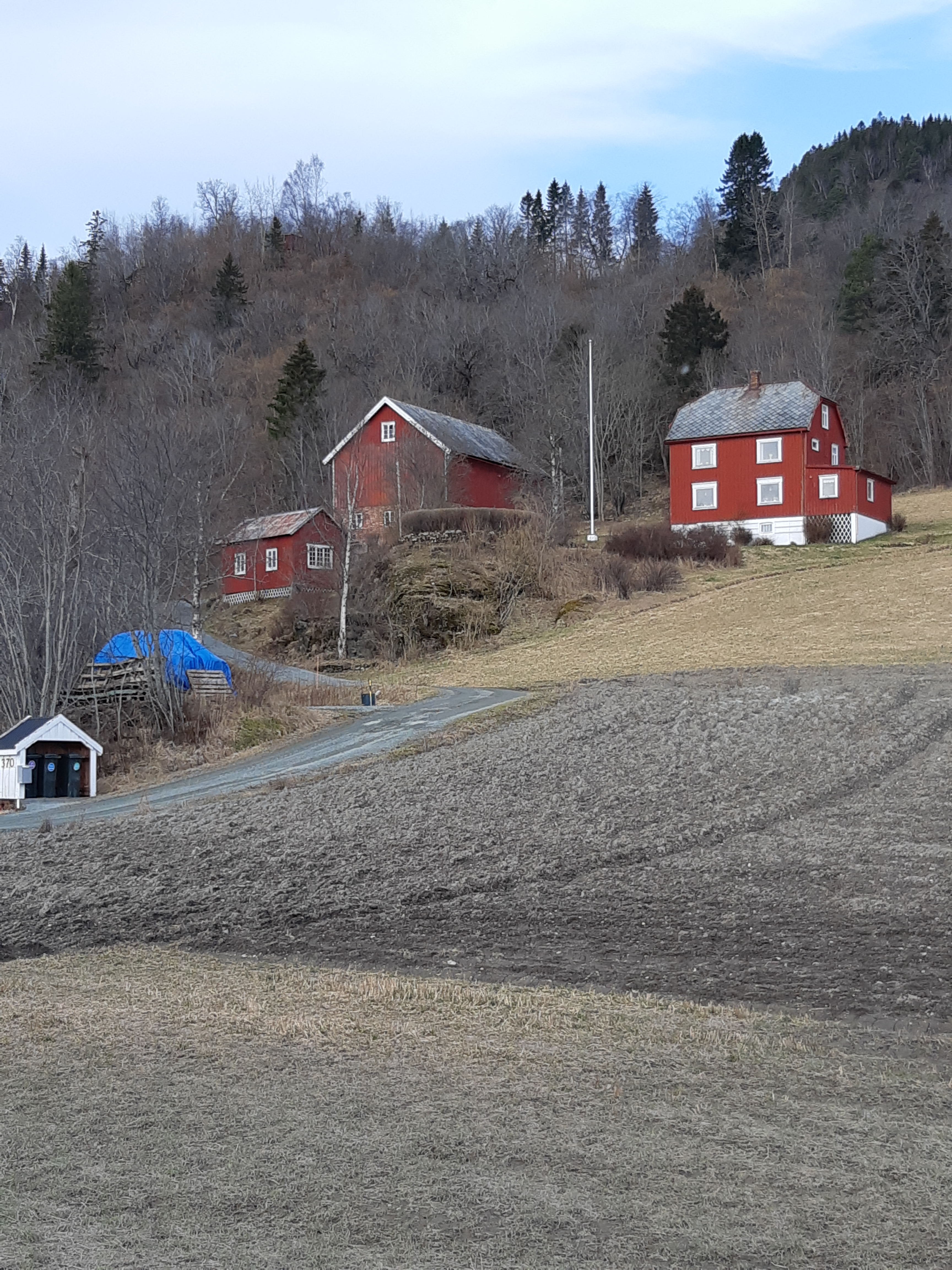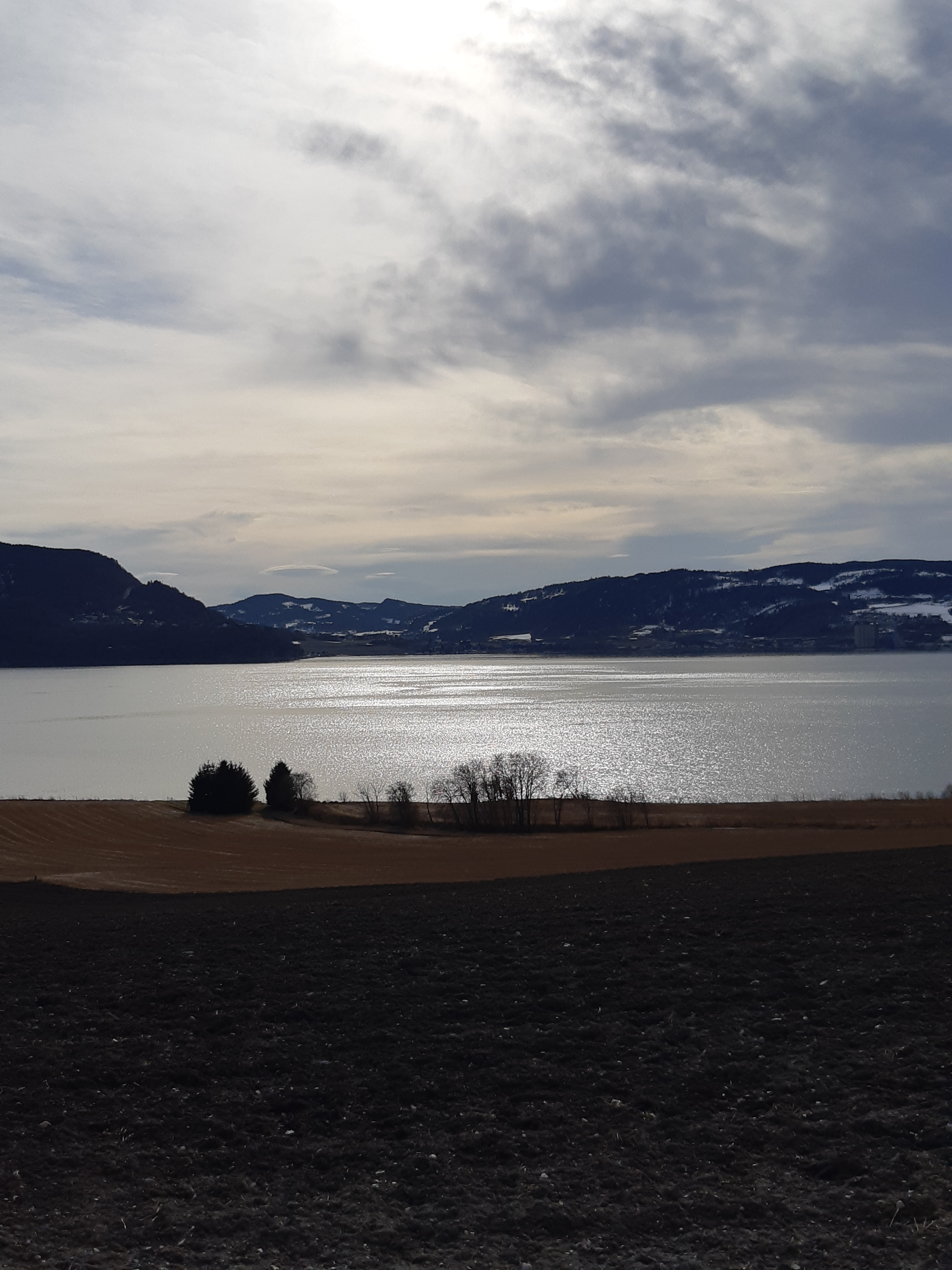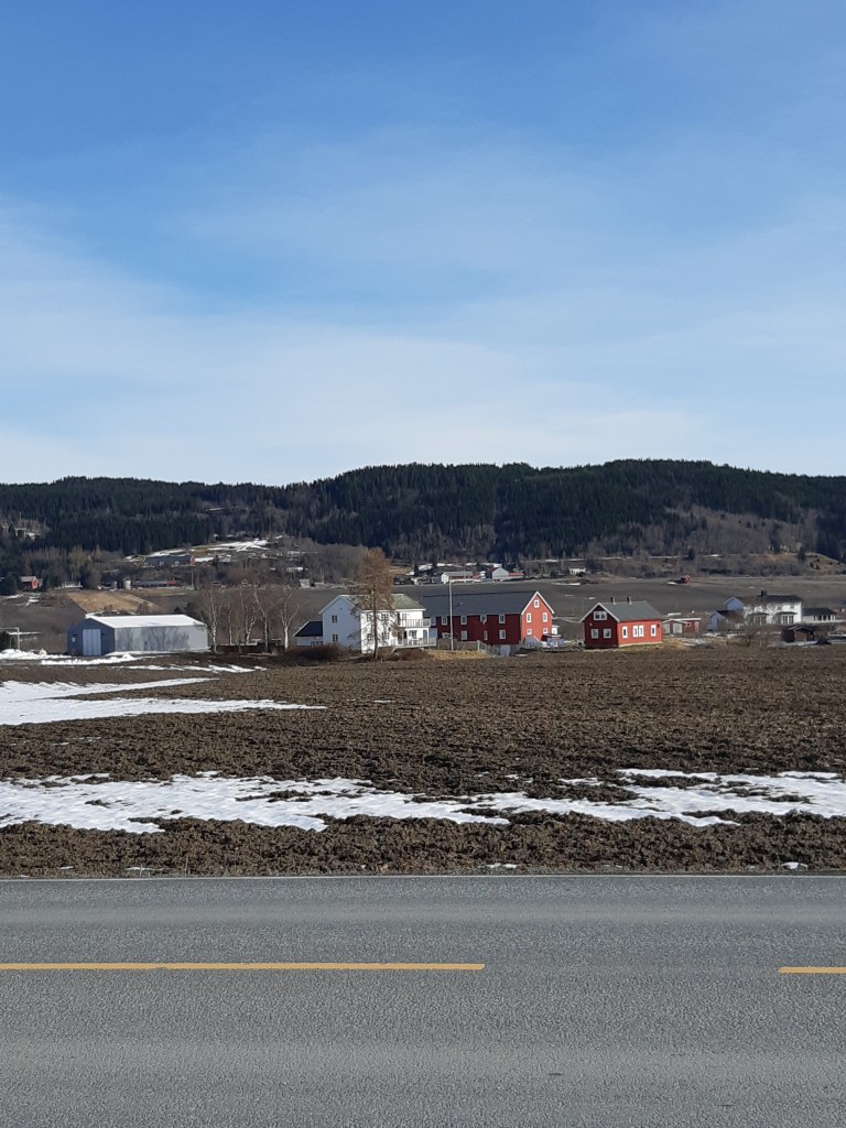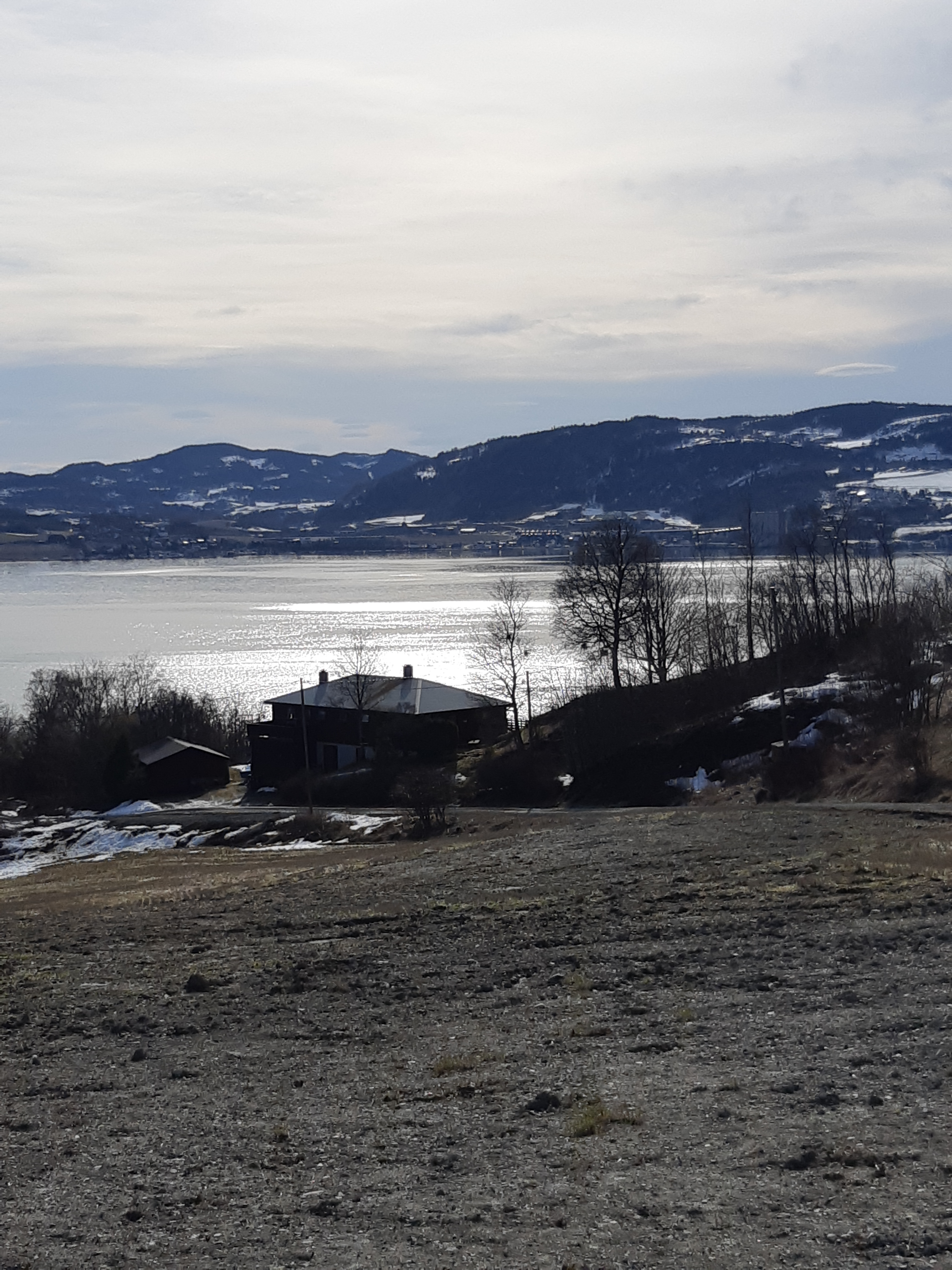 Nach einem kurzen Spaziergang und Orientierung beschloß ich, die neun Kilometer bis zum næchsten Ort, in Richtung Trondheim zu wandern. Hier oben befanden sich einerseits elegante Reihenhæuser, sicher für Golfbegeisterte, gleich am “Trainingsort”, andererseits in der Landschaft bunt verstreut alte Bauernhøfe. Dies hier ist ein klimatisch begünstigtes Gebiet, das sich von alters her besonders für Landwirtschaft eignete. Riesige, noch brachliegende, verschlafene Felder warteten darauf, gepflügt und besæt zu werden. Im weiteren Hintergrund schützten Wælder vor dem kalten Nordostwind. Gemütlich wanderte ich die Straße entlang. Mitunter begegnete ich Hundebesitzern, den einzigen Spaziergængern. Ein høfliches Læcheln des Vorbeigehenden, manchmal ein freundlicher Hund, der mich begrüßen wollte. Ein neugieriges liebevolles Beschnuppern und darauf mein Streicheln mit Worten in Spanisch.- Meine Herzsprache ist Spanisch, nur wenn der Hundebesitzer nahe war, wechselte ich auf Norwegisch… Weiter ging der Weg. Gemæchlich wand sich die Straße hinunter auf Seehøhe. Interessant, den Fjord – Trondheims Fjord ist einer der ausgedehntesten des Landes – aus verschiedenen Perspektiven zu sehen.