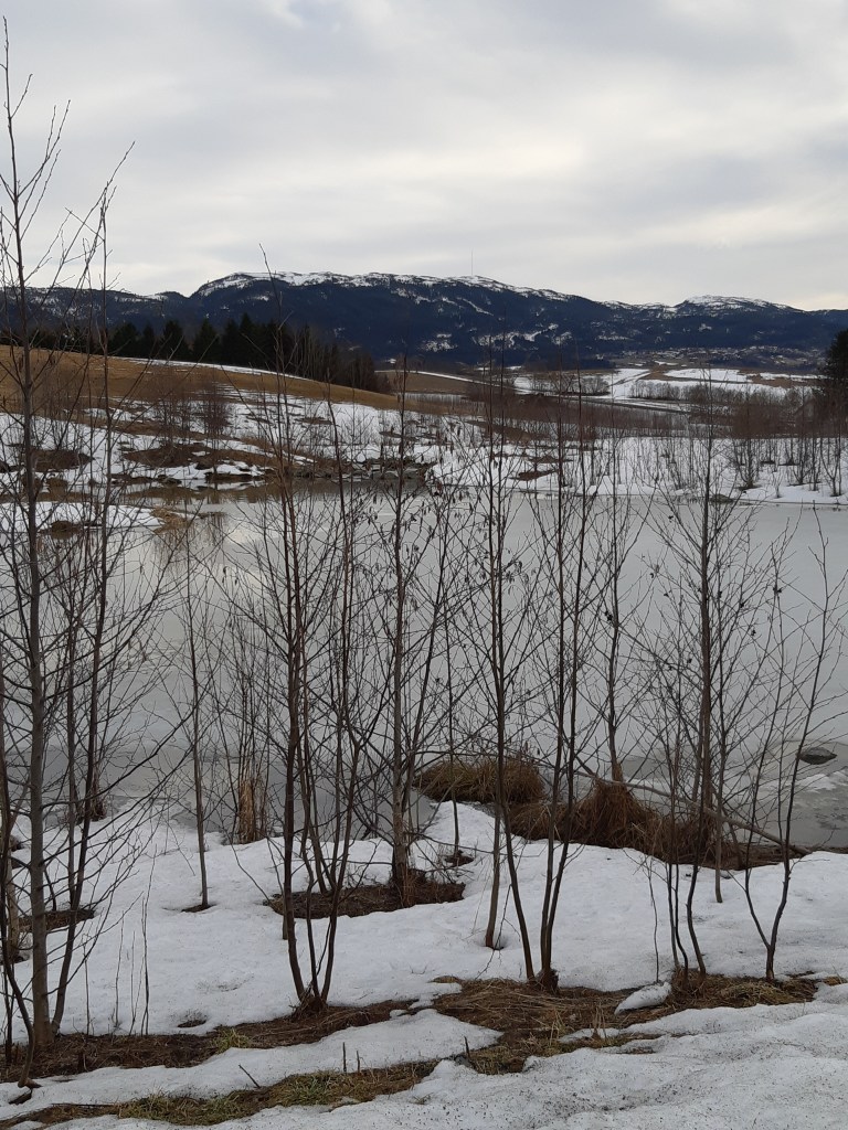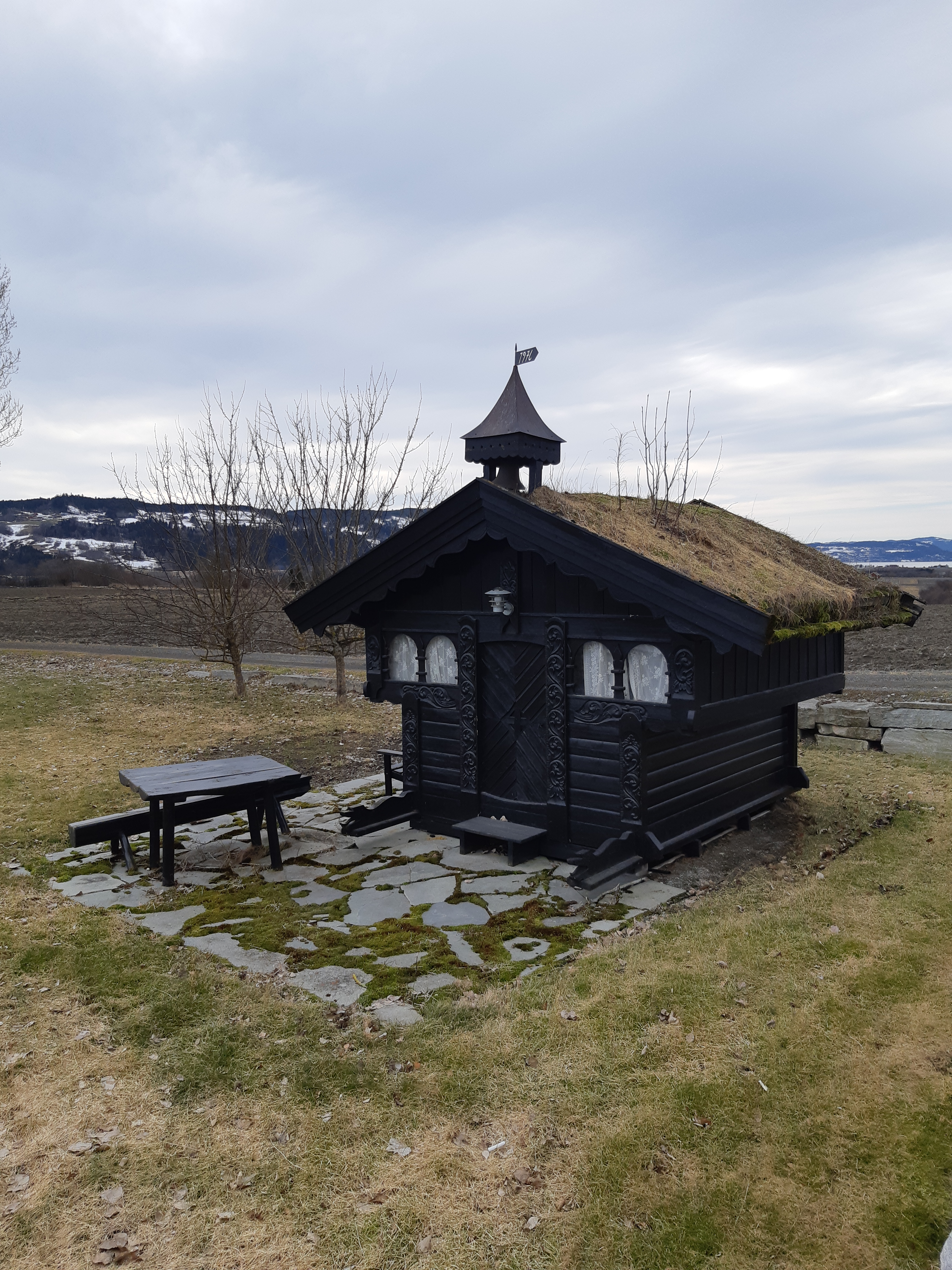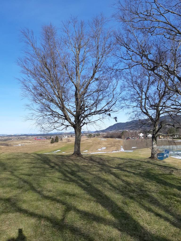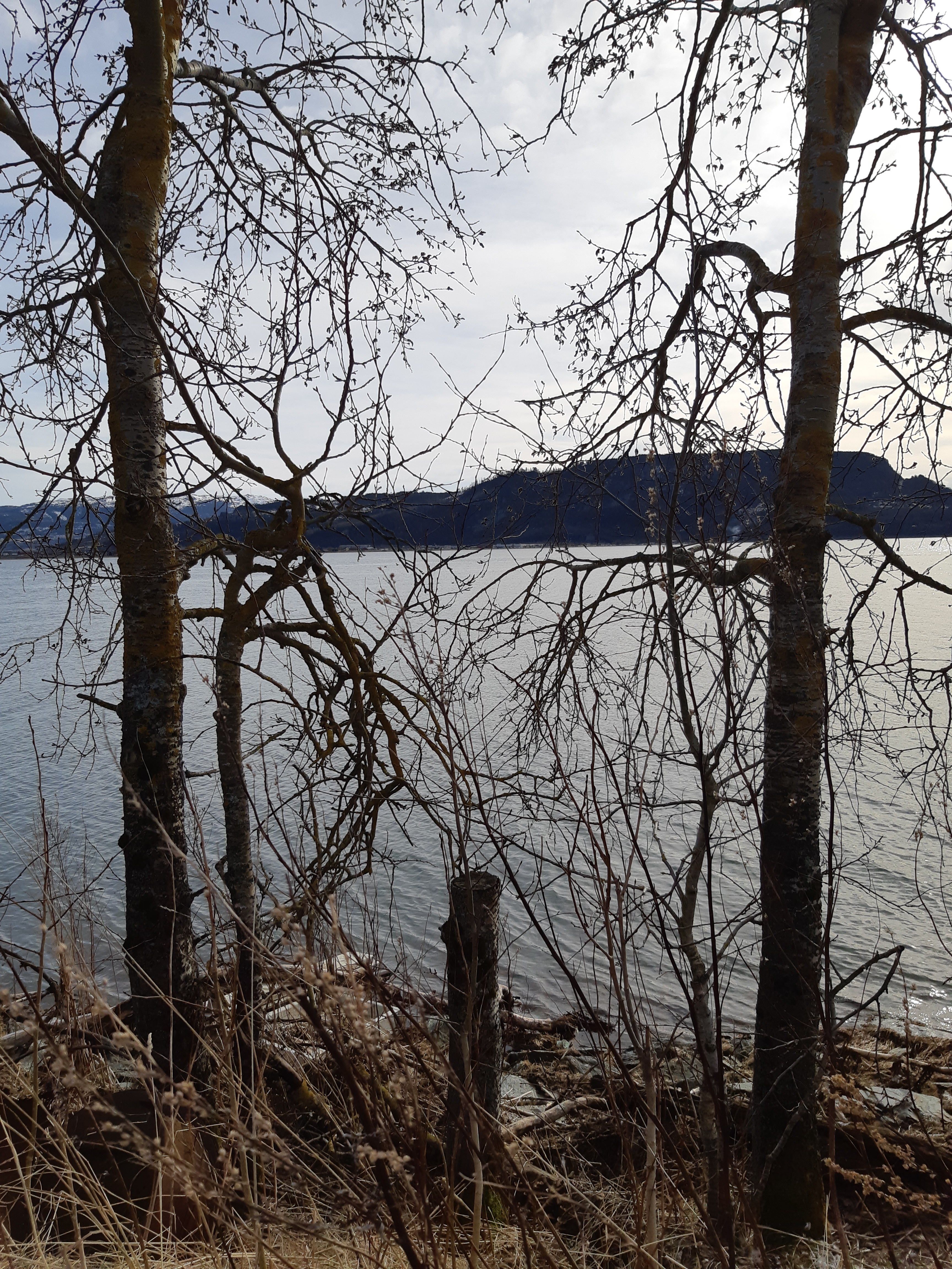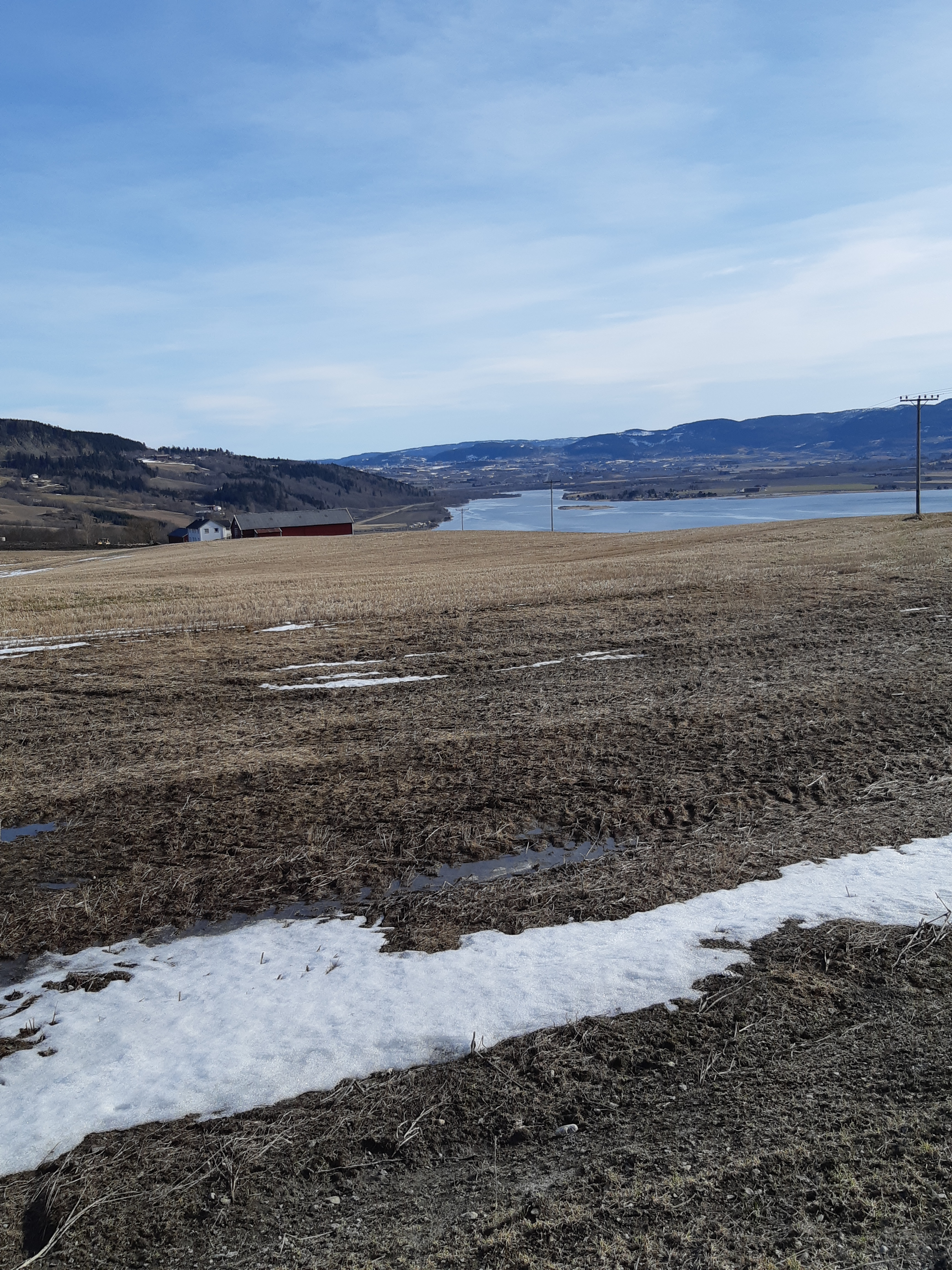 Nach einem kurzen Spaziergang und Orientierung beschloß ich, die neun Kilometer bis zum næchsten Ort, in Richtung Trondheim zu wandern. Hier oben befanden sich einerseits elegante Reihenhæuser, sicher für Golfbegeisterte, gleich am “Trainingsort”, andererseits in der Landschaft bunt verstreut alte Bauernhøfe. Dies hier ist ein klimatisch begünstigtes Gebiet, das sich von alters her besonders für Landwirtschaft eignete. Riesige, noch brachliegende, verschlafene Felder warteten darauf, gepflügt und besæt zu werden. Im weiteren Hintergrund schützten Wælder vor dem kalten Nordostwind. Gemütlich wanderte ich die Straße entlang. Mitunter begegnete ich Hundebesitzern, den einzigen Spaziergængern. Ein høfliches Læcheln des Vorbeigehenden, manchmal ein freundlicher Hund, der mich begrüßen wollte. Ein neugieriges liebevolles Beschnuppern und darauf mein Streicheln mit Worten in Spanisch.- Meine Herzsprache ist Spanisch, nur wenn der Hundebesitzer nahe war, wechselte ich auf Norwegisch… Weiter ging der Weg. Gemæchlich wand sich die Straße hinunter auf Seehøhe. Interessant, den Fjord – Trondheims Fjord ist einer der ausgedehntesten des Landes – aus verschiedenen Perspektiven zu sehen.
