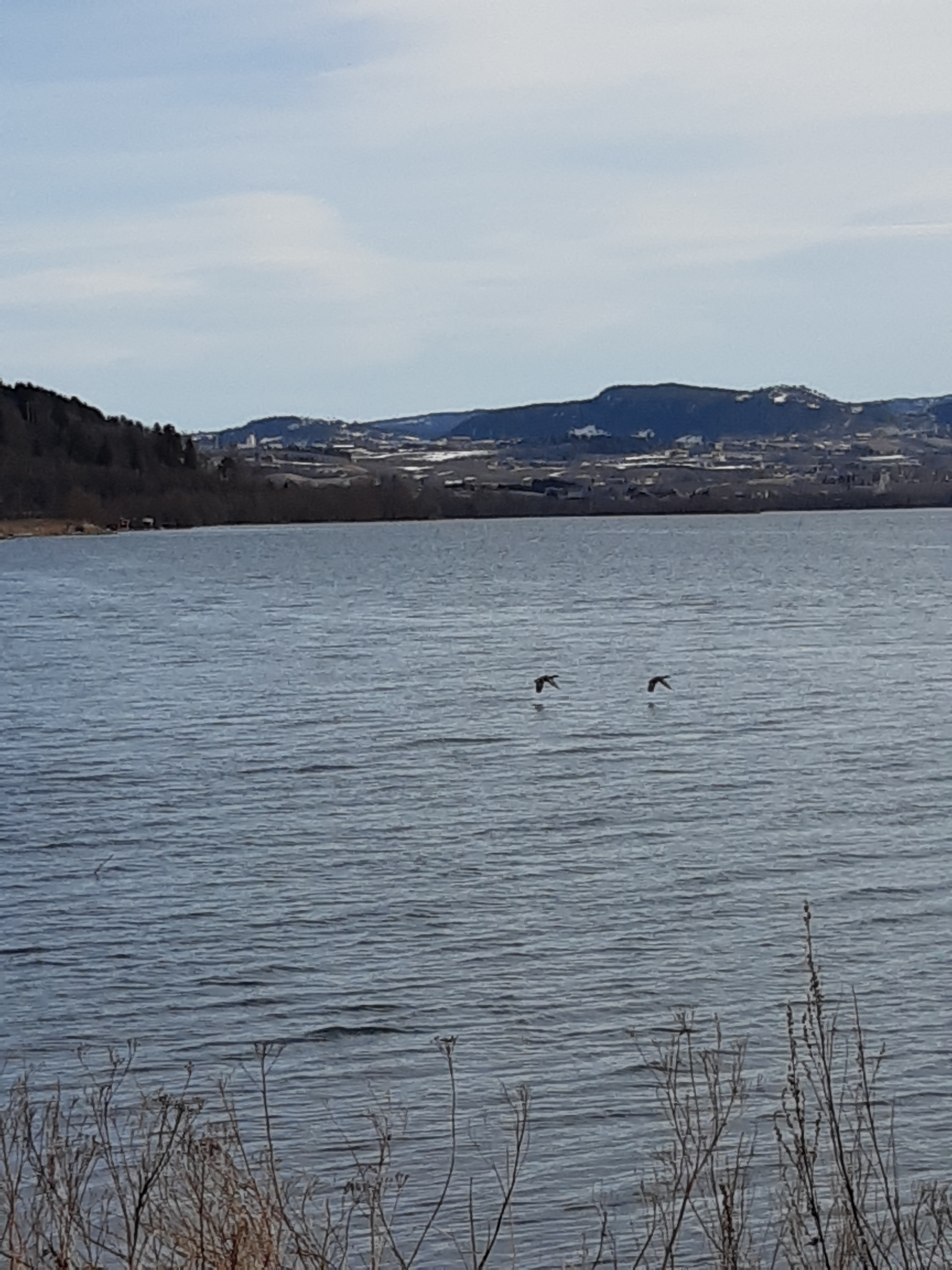 Die Næhe des Gewæssers reizte mich! Ganz nahe wollte ich den Fjord spüren, die Temperatur seines Wassers fühlen. Er übt eine riesige Anziehungskraft auf mich aus! Endlich kam ich an einem Feld vorbei, das bis an den Fjord reichte. Da mußte ich lang! Zu meiner Überraschung fand ich die eine oder andere Miesmuschel am Feld verstreut. Merkwürdig! Hat der Bauer hier Miesmuscheln als Jause verzehrt? Mhm! Da war ich am Ufer des Fjords. Spaßvogel hatte aufmerksam den Weg verfolgt. Sah ganz anders aus, als die Woche davor in Kristiansund! “Na, wie gefællt es dir hier, mein Spaßvogel?”- “Ja, viel zu sehen! So ein weiter Horizont! Und nun die lichtspiegelnde Oberflæche des Wassers! Halt! Da sind Wildenten aufgeflogen! Warum warten die nicht auf uns? Hætte mich gerne mir ihnen unterhalten!” rief nun mein Rabe enttæuscht! Ja, auch ich hætte sie gerne hier am Ufer beobachtet! Doch die Enten wußten das nicht. Sie fürchteten, wir tæten ihnen etwas zuleide. In Kreisen flogen sie in Richtung Ufer, um doch wieder fernab im Wasser zu landen.