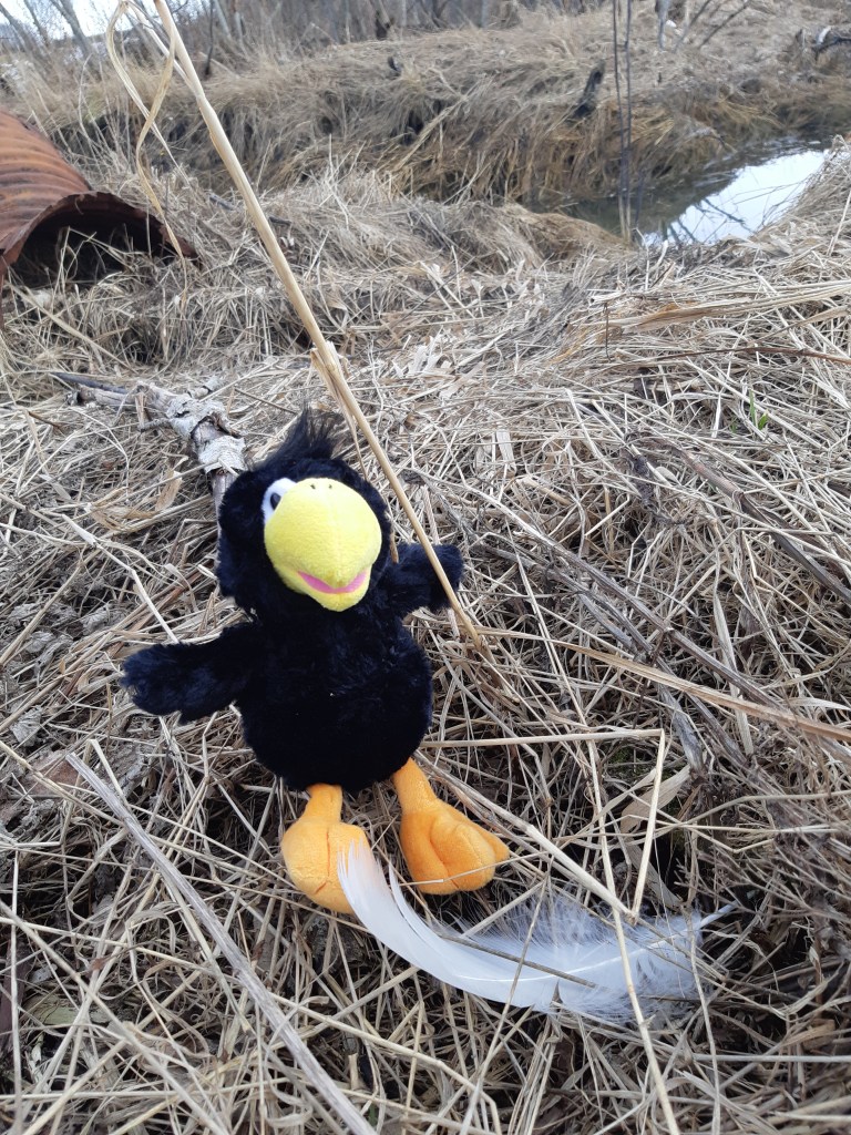 Erneut bot sich mir – uns, ein spannender Annlick: der Fjord næherte sich hier seinem Ende. Es hatte sich eine Insel im stehenden Gewæsser gebildet fie nun einen interessanten Lichteinfall hatte. Da wollte ich hin! Wieder über ein Feld! Diesmal war es ein sehr feuchtes Feld. Das erinnerte mich an die Geschichte, die ich über diese Region gelesen hatte: bis zu Beginn des 20. Jahrhunderts ist hier Torf abgebaut worden, der getrocknet vor allem als Heizmatetial diente. Dabei fand ein Arbeiter ein Schmuckstück, das weit zurück datiert wurde. Im Moor war es gut erhalten geblieben. In diesen Gedanken versunken kam ich dem Ufer nahe als ich eine wunderschøne, große weiße Feder vor mir liegen sah. Ich setzte Spaßvogel an ihre Seite, um die Grøße hervorzuheben. – Grüße aus einer anderen Welt…