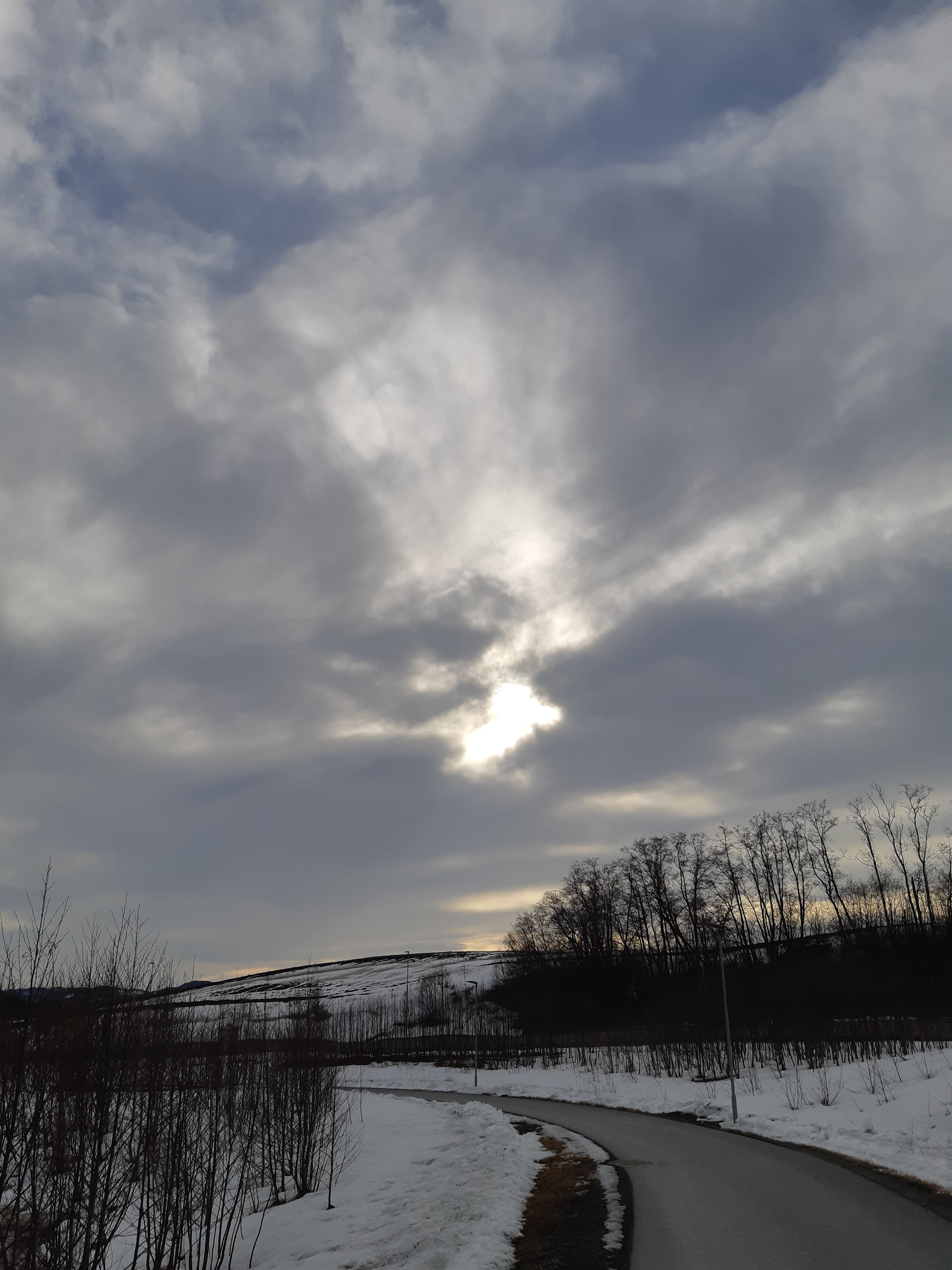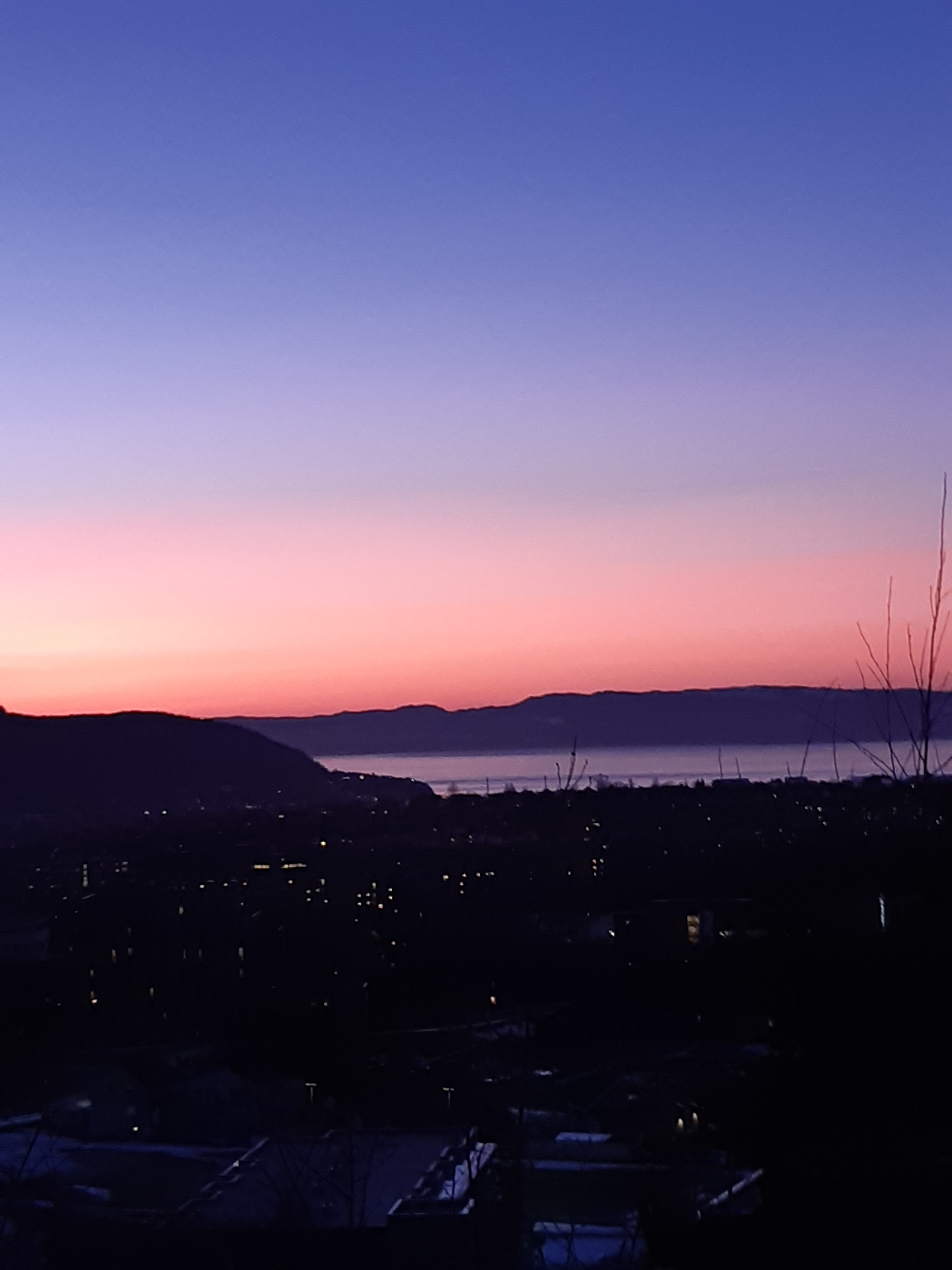 Stracks ging ich neuen Mutes in Richtung Trondheim! In all dieser Entfernung auf der Landstraße war kein direktes Haus gewesen, fast bis an diesen Hof. Der Weg führte nun kræftig bergauf: ein Radweg entlang einem Bach, parallel zu einer Gemeindestraße, die ins Zentrum führte. Wieder machte ich halt, um etwas zu ruhen und den letzten Proviant zu verzehren. Nach geraumer Zeit kam ich in Heimdal, dem südlichsten Stadtteiles von Trondheim, an. Da gab es wieder Autobusse, die alle zehn Minuten verkehrten! Welch Freude! Dieser Ausflug hatte sowohl Spaßvogel, wie mich, ordentlich ermüdet! Wir waren ungefæhr 15km marschiert! Zuhause genoß ich zum Abschluß des Tages einen herrlichen Sonnenuntergang von meiner Terrasse!