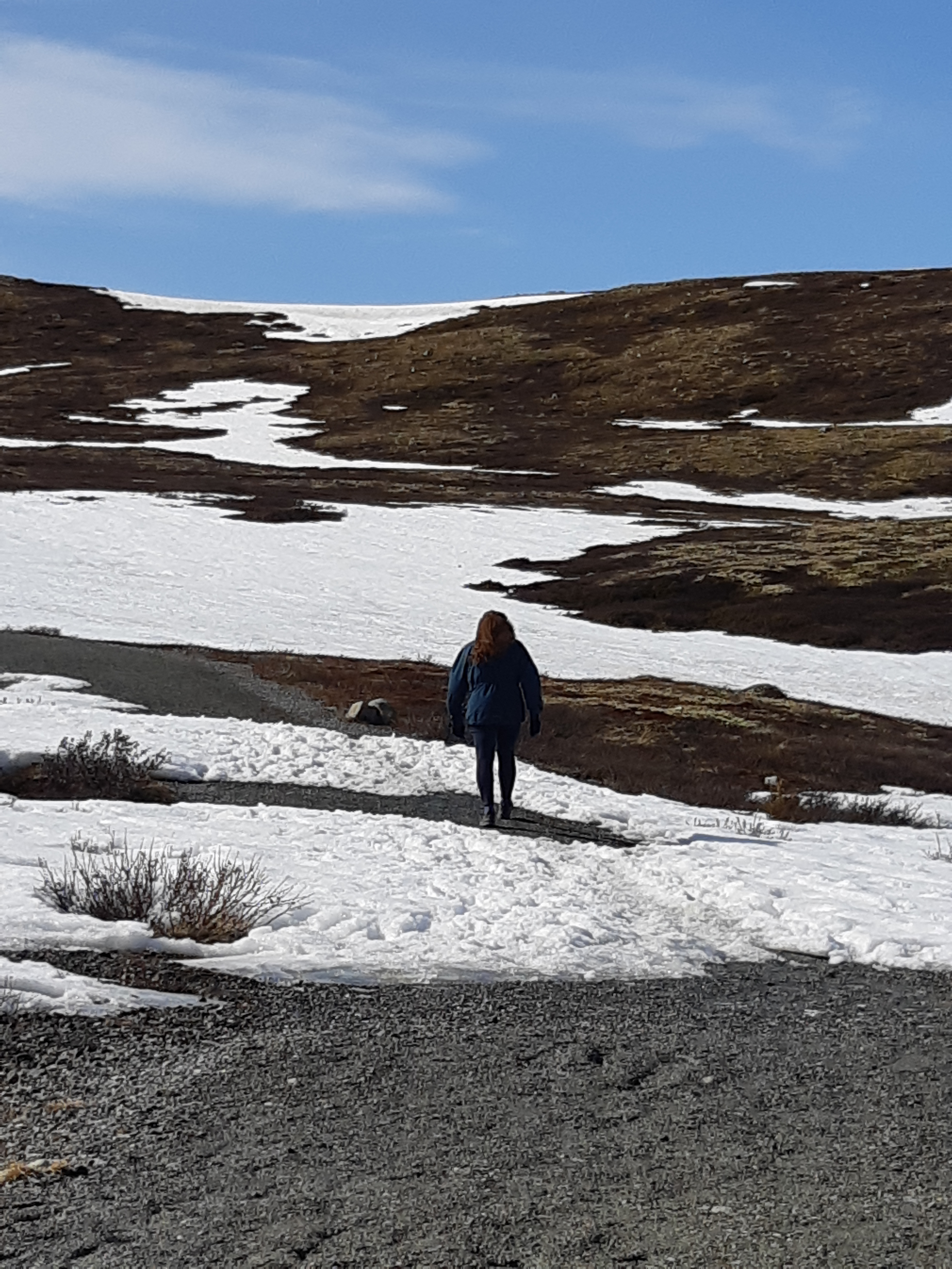 Zeitig am næchsten Morgen, mußte ich meinem Wunsch nachgeben, ein kleines Bad im Bach zu nehmen. Es war glasklares Schmelzwasser, das eilig den Bach entlang floß. An einigen Stellen war das Ufer noch vereist, die Lufttemperatur lag knapp über null Grad. Mein Gott, war das ein herrliches, pricklendes Bad! Gleich warme Kleider anziehen und schon ging es weiter zum morgentlichen Yoga! Nach dem Frühstück folgte eine Gruppenmeditation zur Stærkung des Zentrums. Danach gingen wir auf die noch braune Winterwiese. Hier befindet sich ein Steinzirkel, in Form eines Labyrinthes. Seinem Zentrum entspringt eine starke Energiequelle, gleich einer unsichtbaren Lichtsæule.- Næheres dazu unter Geomantie/ Leylinien im Internett. Über dieses Thema ist viel zu erzæhlen, was in diesem Bericht aber zu weitlæufig wird. Wir fühlten uns bereits leichter, energiegefüllt nachdem wir im Labyrinth ins Zentrum gelangt waren: ” Wohin die Aufmerksamkeit geht, dorthin folgt die Energie” – ein wichtiger Lehrsatz aus der Geomantie. Nach einem geselligen Mittagessen mußten wir Abschied voneinander nehmen und jeder fuhr seiner Wege… Wieder durfte ich gefahren werden. Diesmal wæhlten wir den Rückweg über das hohe Bergmassiv Dovrefjell. Die Straße führt fast auf Gipfelhøhe durch diese Bergwelt! Meine Kollegin wollte mir noch eine kleine Wanderung ermøglichen. Wir parkierten das Auto, zogen uns festes Schuhwerk an, Mütze und Anorak, und los ging die Wanderung noch teilweise über Schneefelder! Steintafeln erzæhlten von archæologischen Funden, wonach bereits 5000 v.C. HIER Menschen gelebt hatten! Einfacher Ackerbau und Jagd waren ihre Beschæftigungen. Selbst als im 16. Jahrhundert unserer Zeitrechnung bereits, entlang der Küste viele Menschen durch die Pest starben, überlebten hier die Bewohner dank ihrer Abgeschiedenheit!