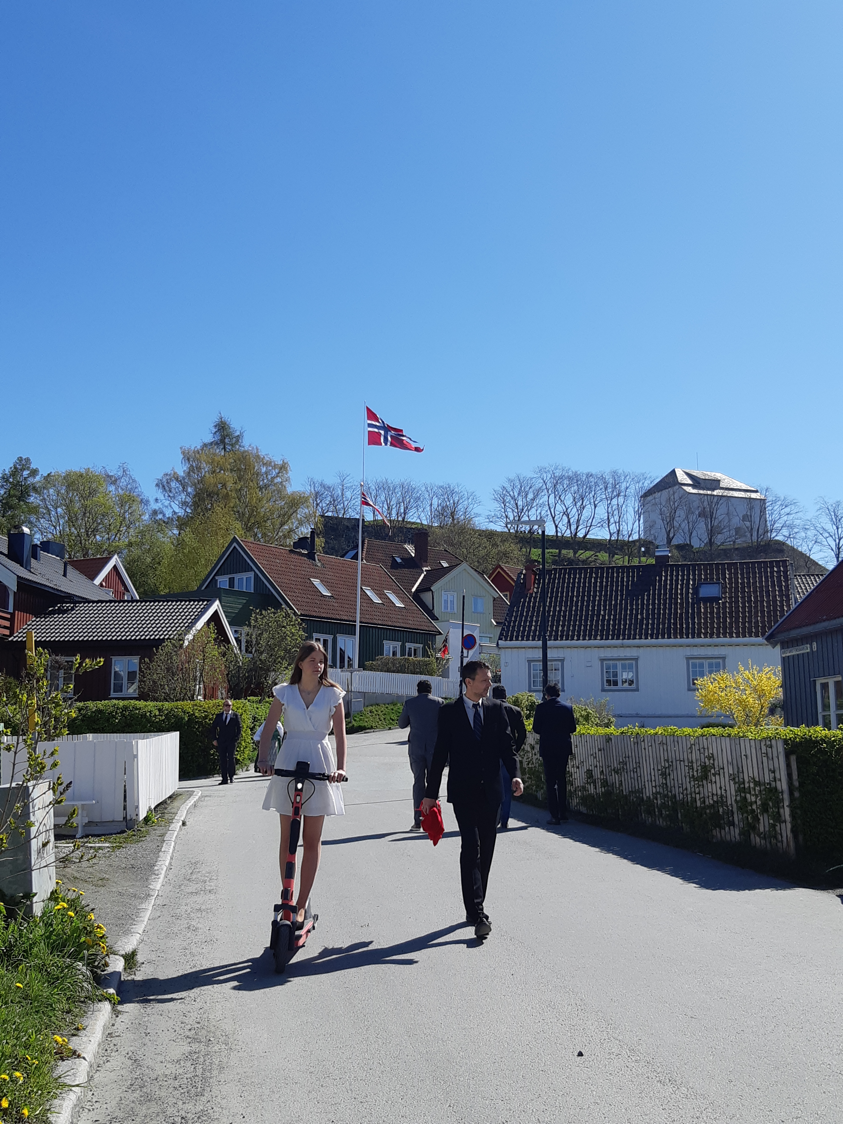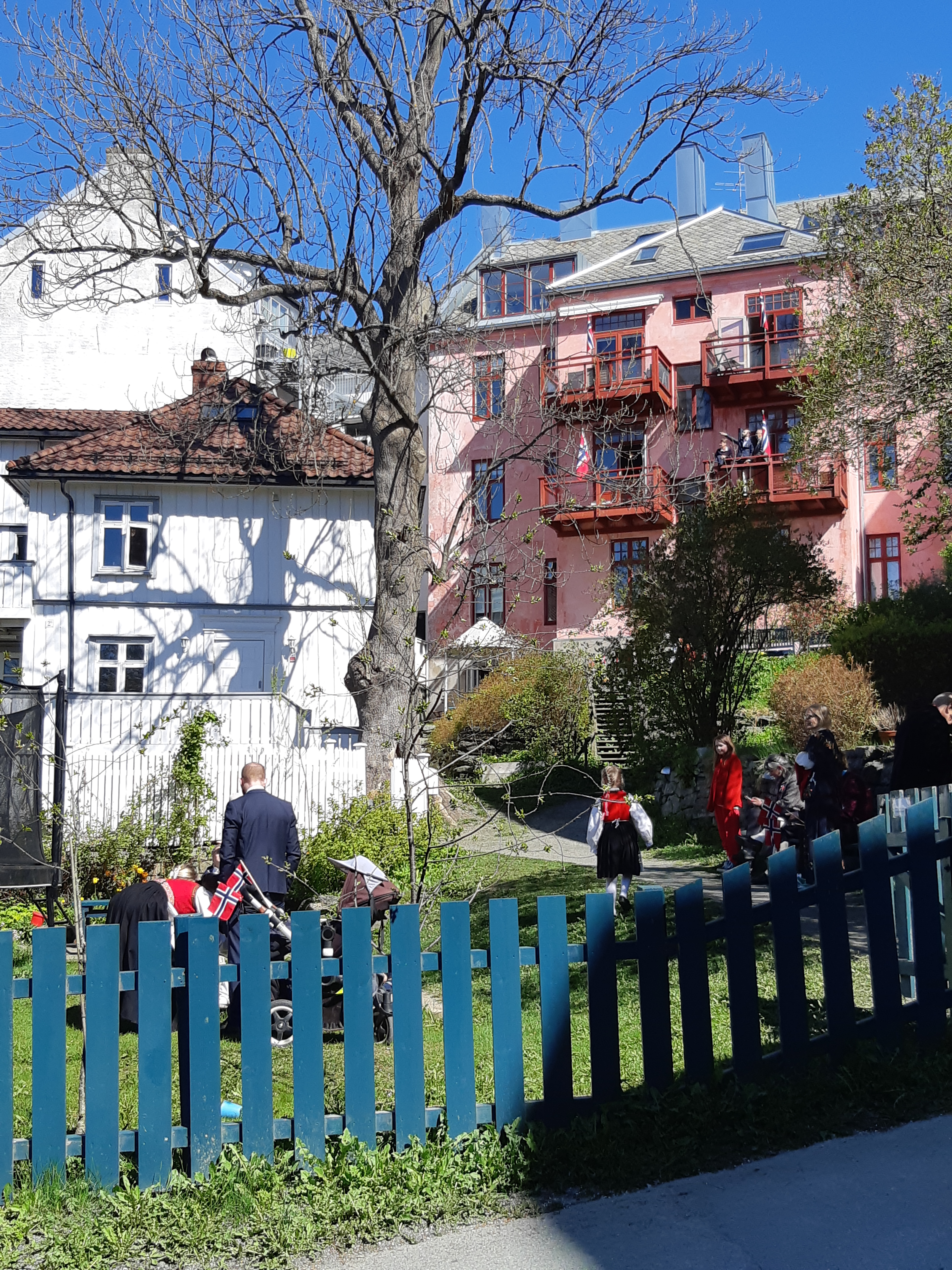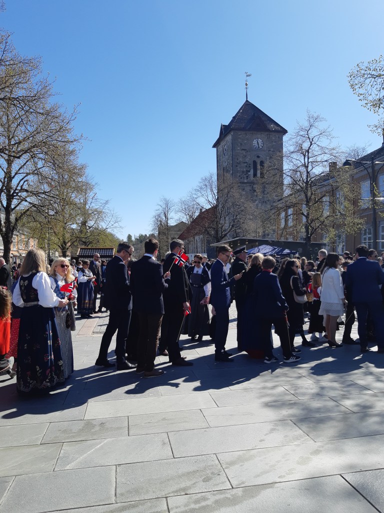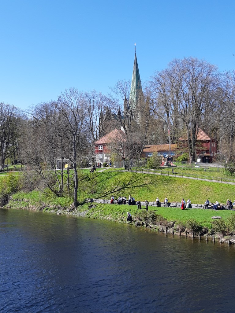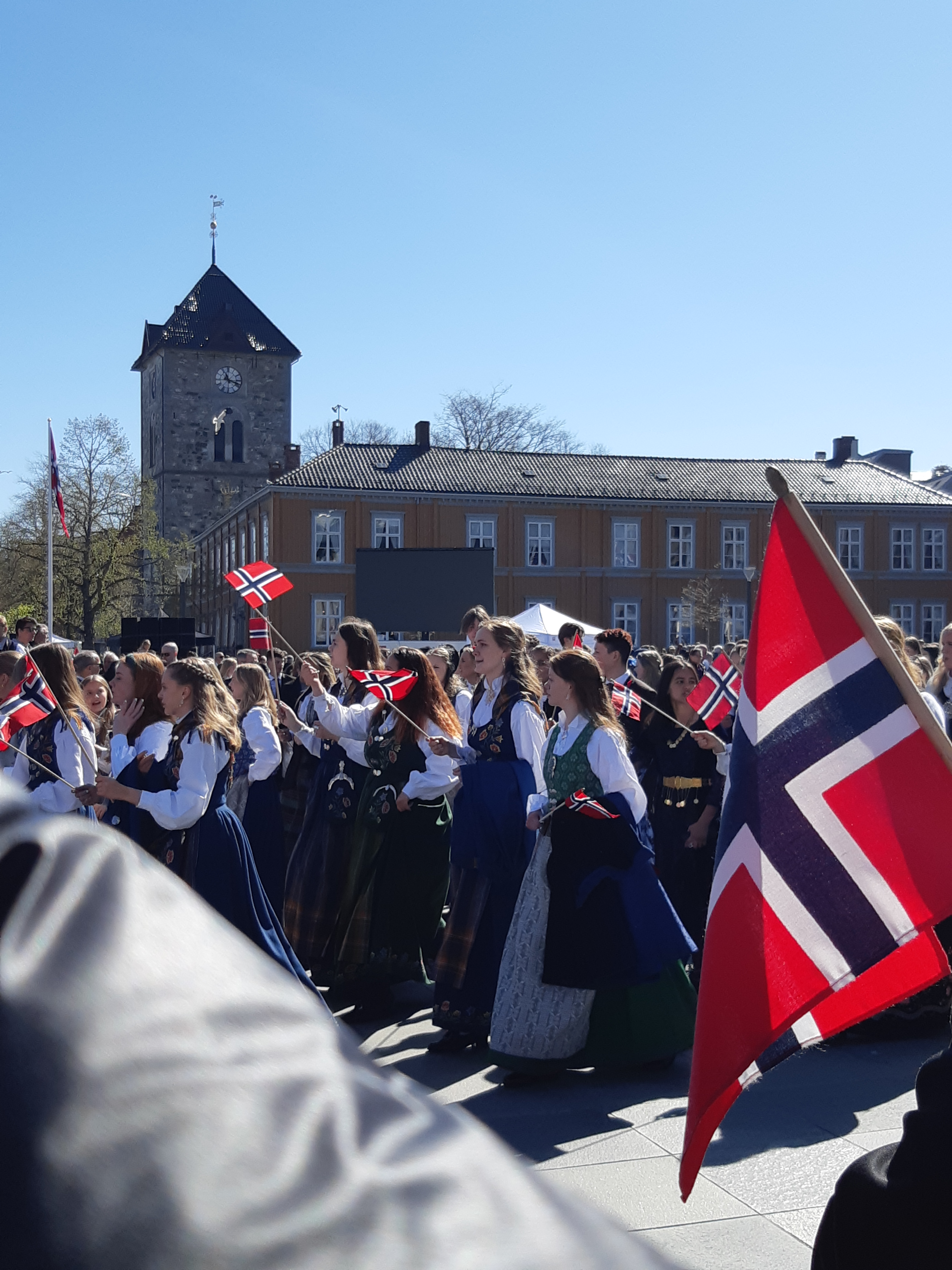 Endlich war Dienstag 17. Mai! Diesmal freute sich ganz Norwegen auf diesen Tag – und zitterte wettermäßig ihm entgegen! Endlich! Nach drei Jahren durfte wieder øffentlich gefeiert werden! Der Wettergott war dem Volk freundlich gesinnt: trocken und milde Temperaturen, in Trondheim herrlicher Sonnenschein! Nun konnten die Norweger glücklich und stolz ihr Land feiern, ihre Freiheit, ihre Unabhængigkeit! – Alle geschichtlichen Daten dazu findet Ihr in meinem Buch. Noch schwankte ich, ob ich meine østerreichische “Tracht”, mein Dirndl anziehen sollte oder nicht. Nicht wegen der Tracht, sondern der noch kalten Luft. Doch ich rang mich durch, hatte ich doch auch eine Trachtenjacke!