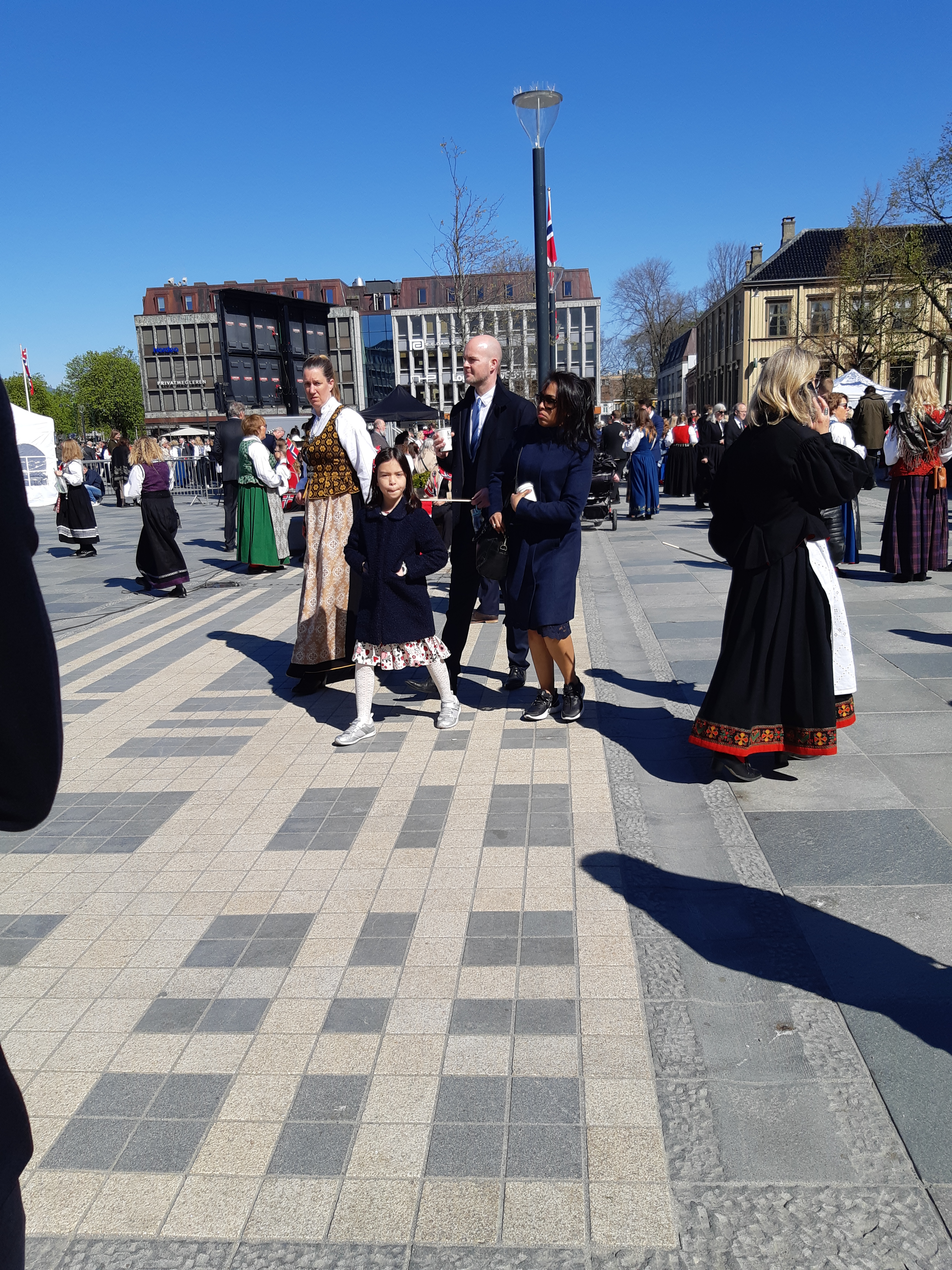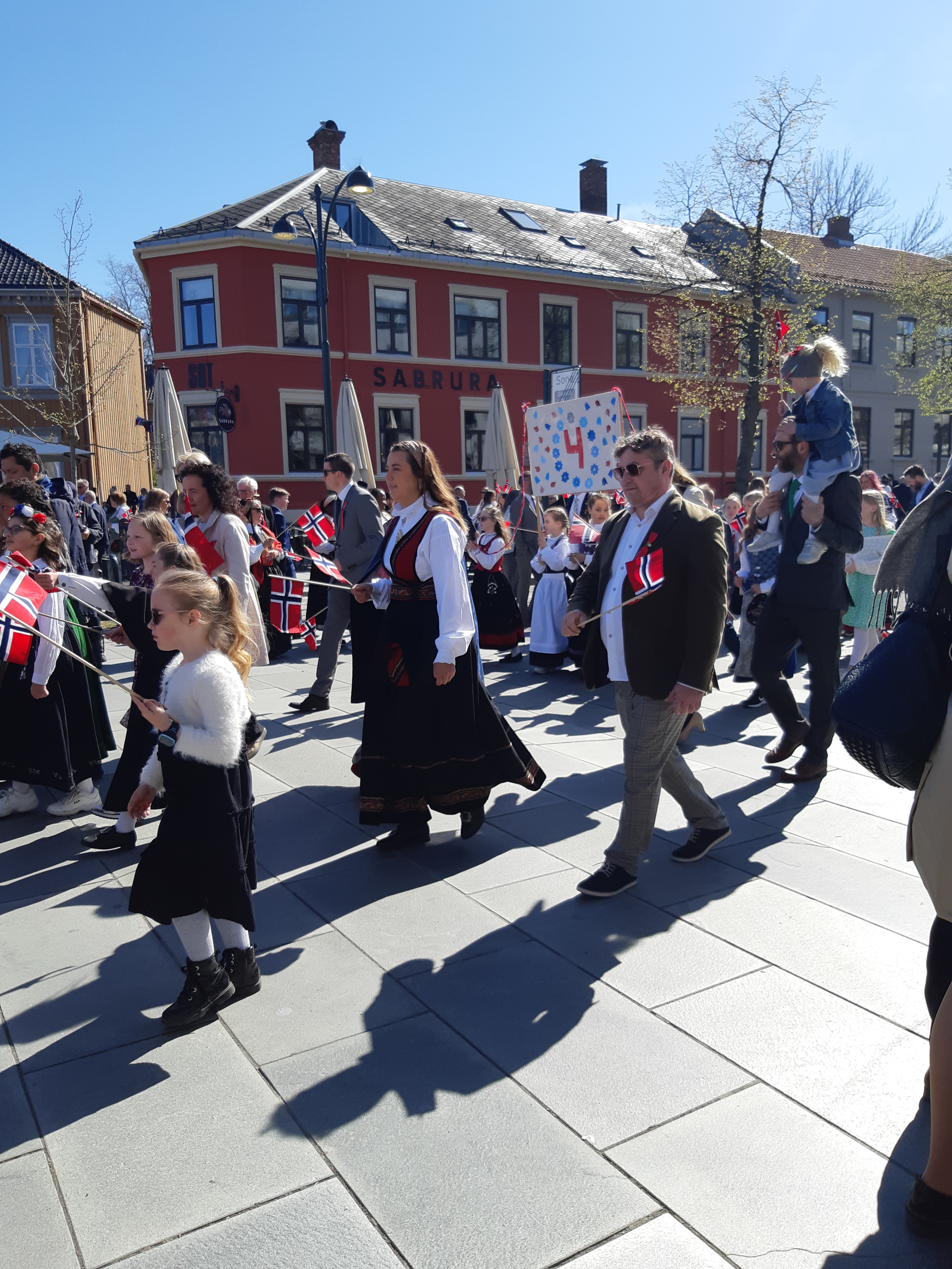 Sicher waren alle Schulen Trondheims mit ihren Musikkapellen und Schülern vertreten, die vorbei marschierten: groß und klein! Wæhrend in den meisten Lændern am Nationaltag die Militærparaden im Vordergrund stehen, sind es in Norwegen die Kinder, sie, die morgen die Nation tragen! Es ist ein Fest in und für jede Familie! Man speist in einem guten Restaurant, sieht und wird gesehen!