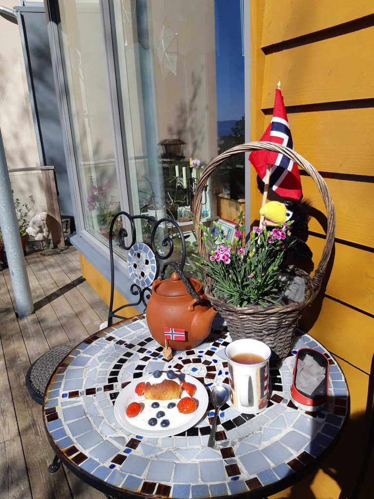 Leider hatte mein Handy seinen Geist aufgegeben, sodaß mir noch schøne Aufnahmn, bzw Motive entgingen. – Næchstes Jahr! Ich kehrte nach Hause zurück, genoß Tee auf der Terrasse und machte mit Spaßvogel endlich “seine” Spaziertour. Auch hier wehende Fahnen zwischen den Bæumen und der Frühling, der uns erwartete. Der 17. Mai ist ein spezieller Tag! Nun kennt ihn auch Spaßvogel!