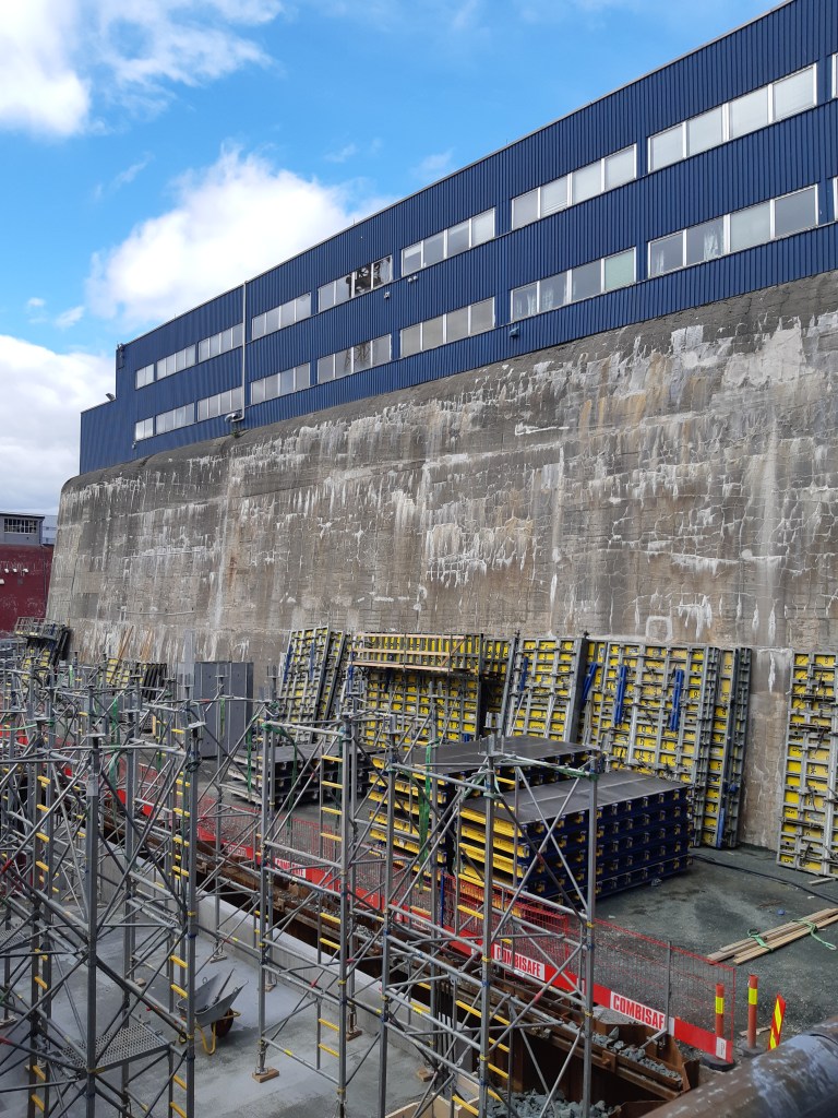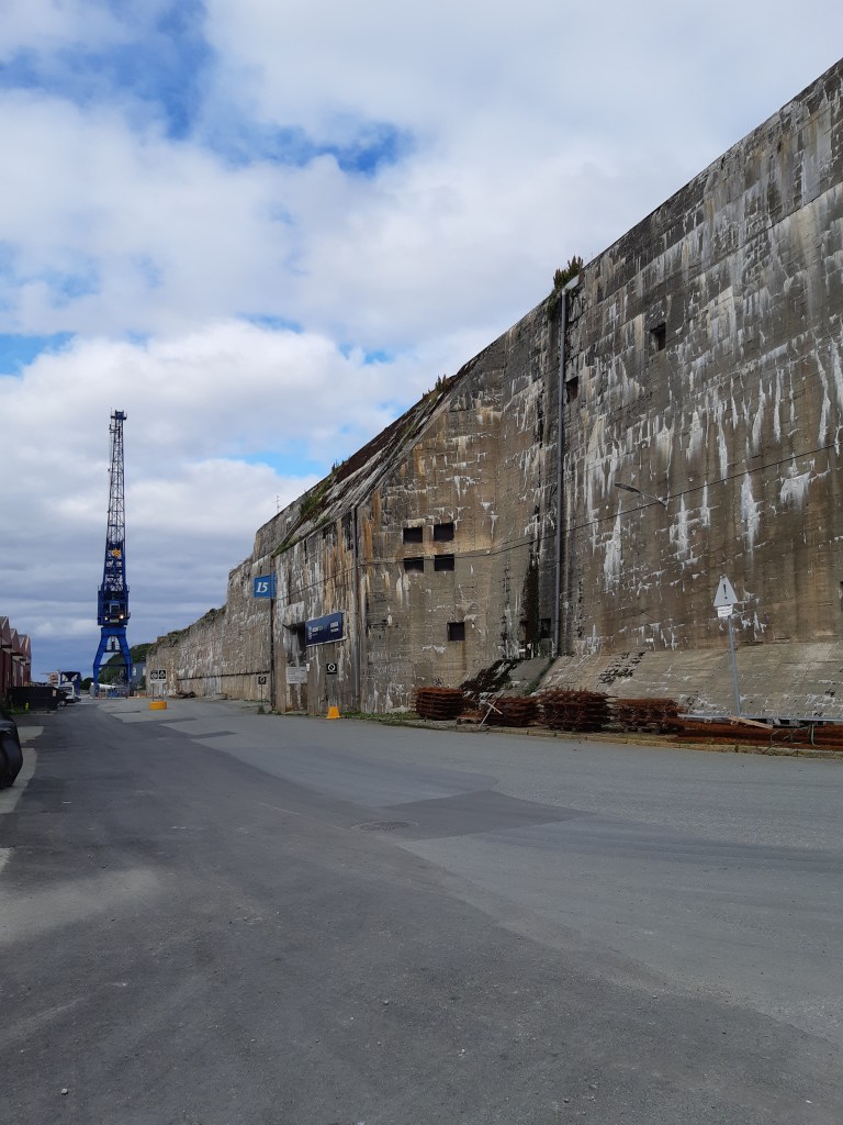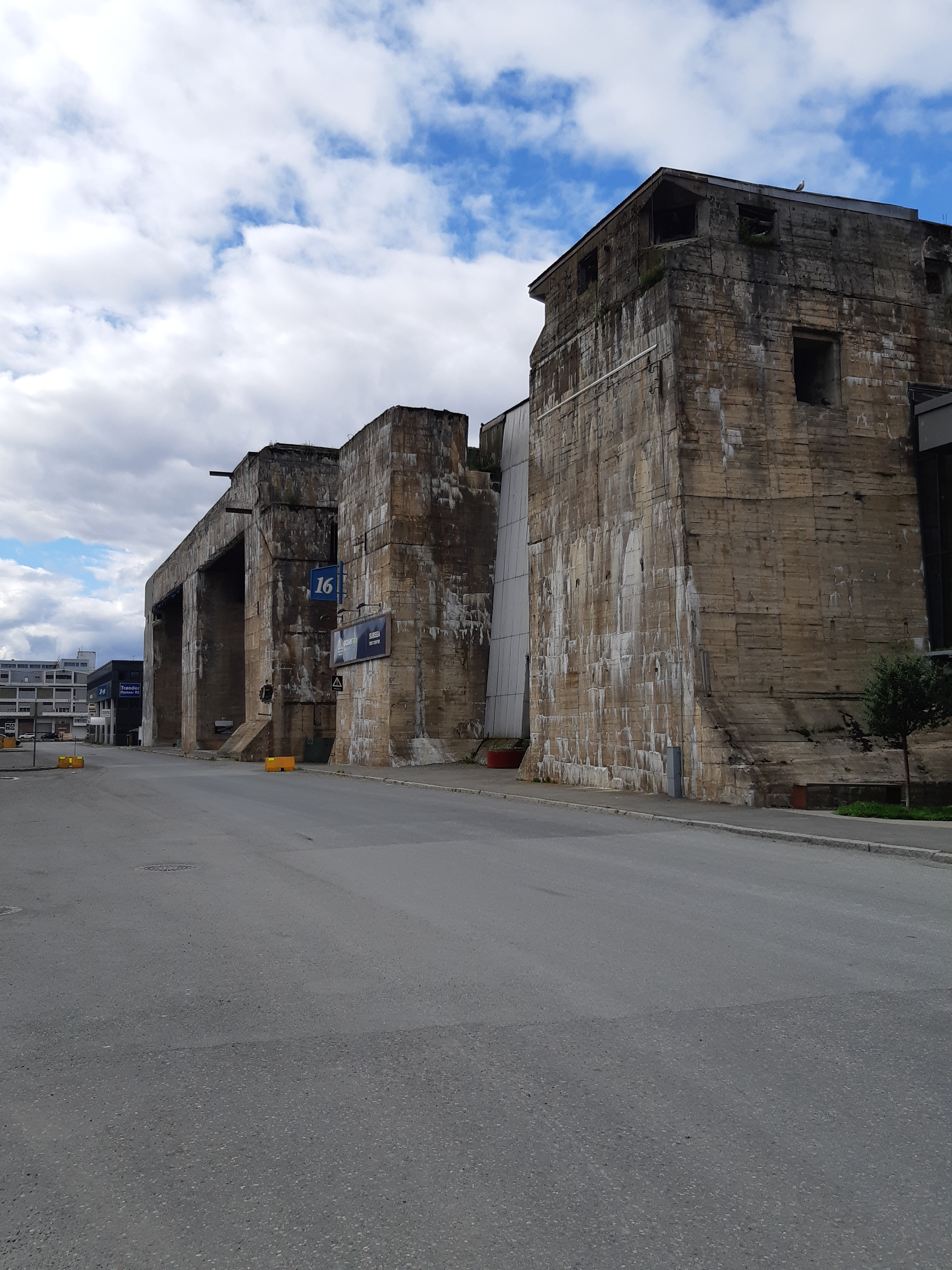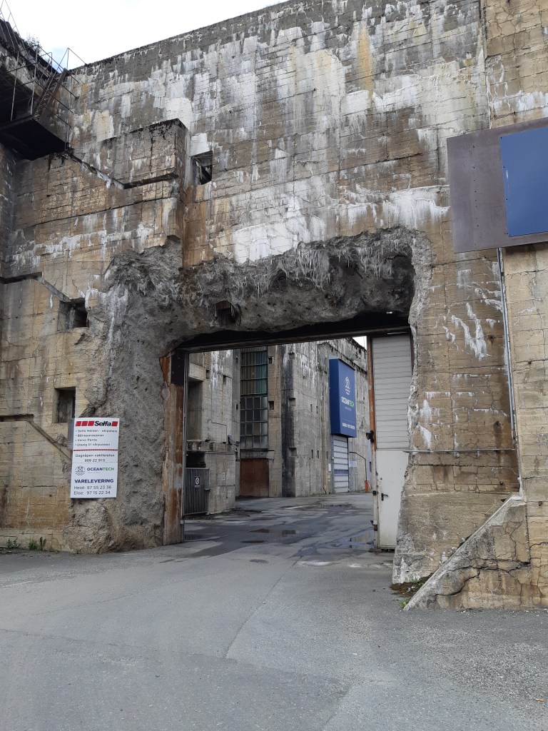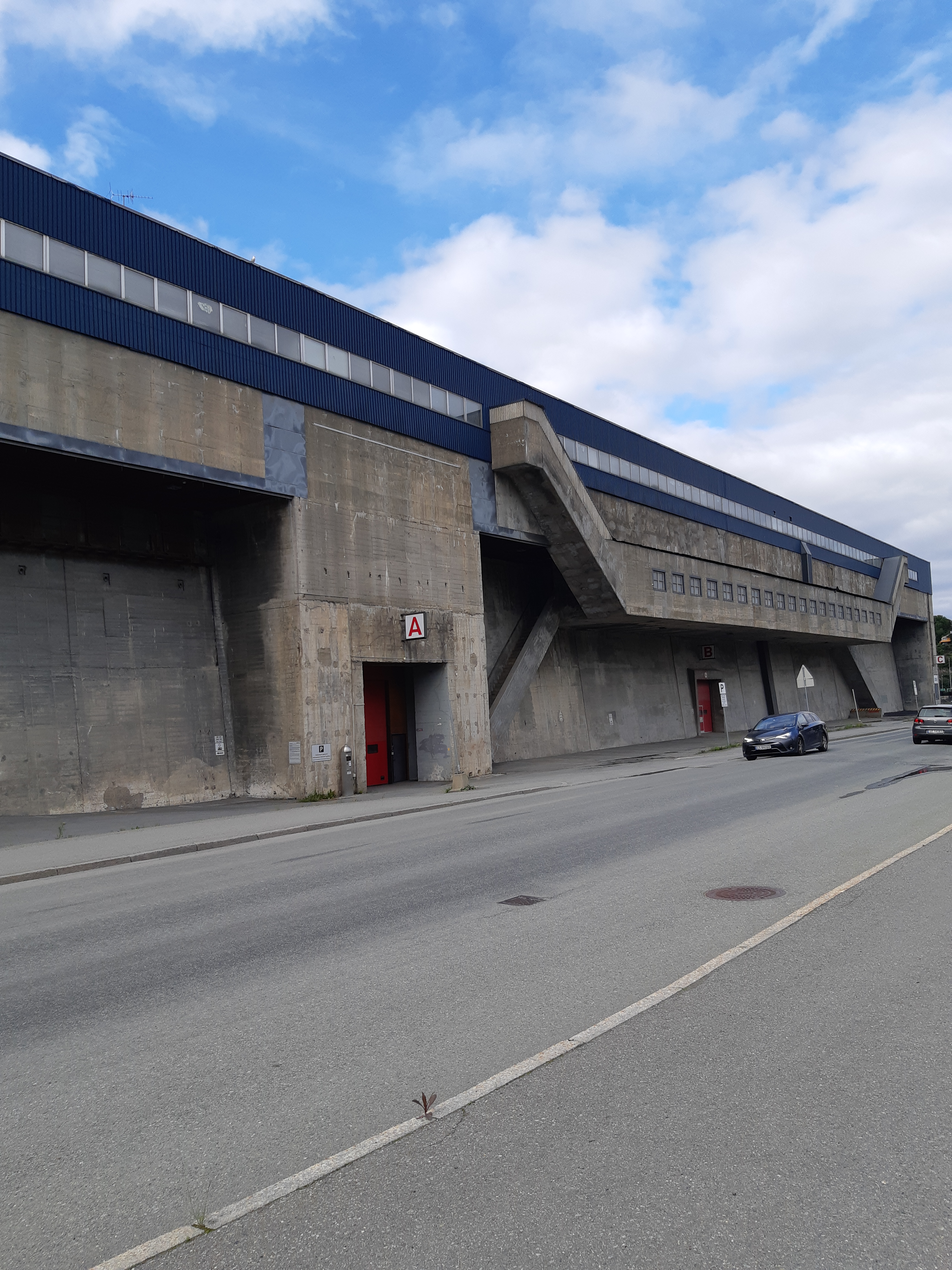 Nun, gestern auf der Suche nach einem Lager alter Møbel, kam ich dorthin und sah mir alles genau an. Interessante Erklærungen waren ebenfalls angebracht. Wie gesagt ist es im wahrsten Sinn des Wortes, ein trostloser Ort. – Doch er gehørt mit zu Trondheim und zur Geschichte der Stadt. Im Juni 1940 unterzeichnete Trondheim den Nazis gegenüber den Kapitulationsvertrag, im besten Hotel der Stadt: Hotel Britannia. Adolf Hitler hatte hier große Plæne. Um seinen Krieg fortzuführen, brauchte er Zugang zum schwedischen Eisenerz über den Hafen von Narvik weiter im Norden gelegen. Trondheim sollte zum wichtigsten strategischen Ort Norwegens für sein Unternehmen werden. Auf die Stadt Trondheim verteilt, hatte er Artillerie, Luftabwehr und strategische Administration. Hier im “Neuen Hafen” – Nyhavnet- sollten U-Boote gebaut werden. Dieses Riesenprojekt erhielt den Namen “D”- im Alfabet als “Dora” bekannt. Trondheim war damals im Deutschen als “Drondhjem” geführt, daher das “D”. 16000 Quadratmeter Grundflæche hat diese erste Anlage. Die Stahlbetondicke der Wænde ist ungefæhr 3 Meter, die Decke soll vier bis fünf Meter Dicke haben!