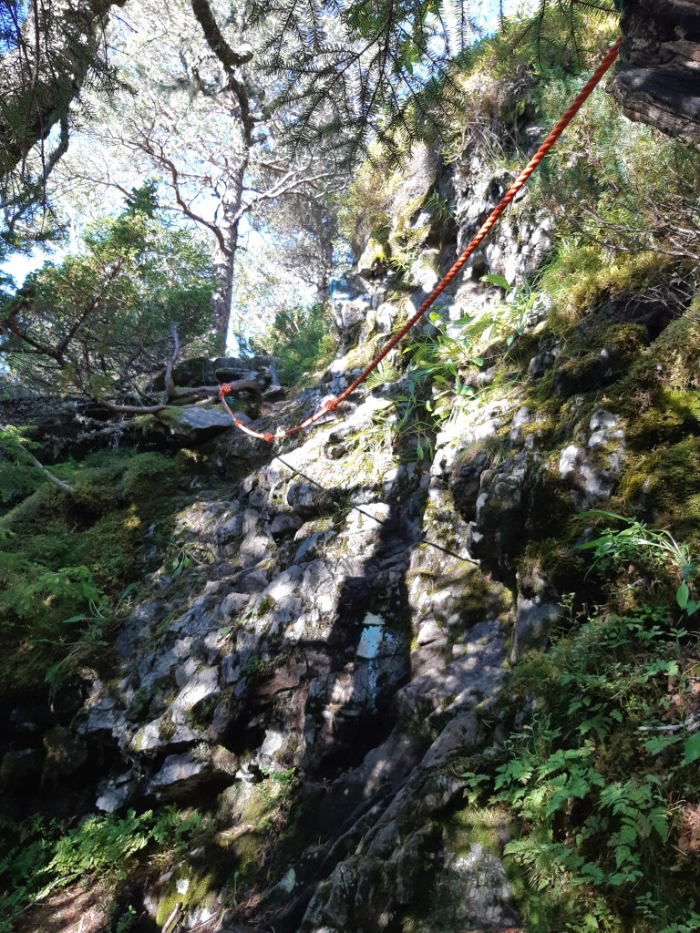 Immer weiter… huch! Jetzt auch noch mit einem Seil weiterklettern! Das erinnerte mich an Kristiansund, wo es auch keinen Weg zurück gab! “Und das auf meine alten Tage!” Doch endlich! Das Felsplateau! Gott! Welch atemberaubende Aussicht!! Ja, schwindelnd und atemberaubend! Aber ich hab’s geschafft!