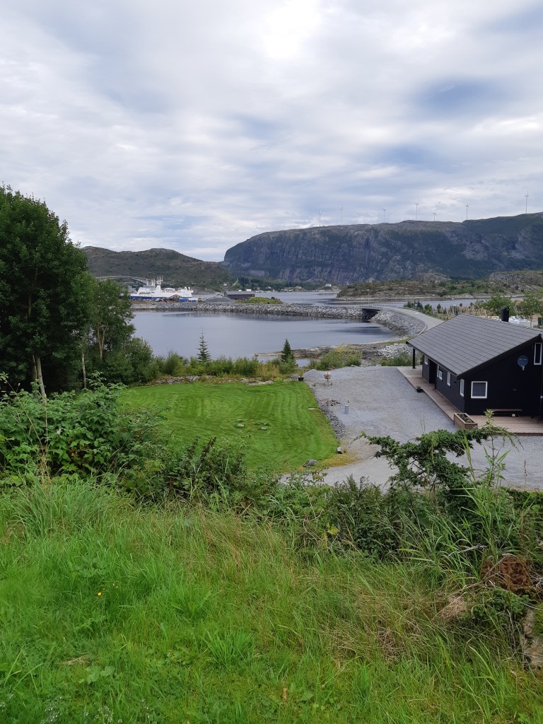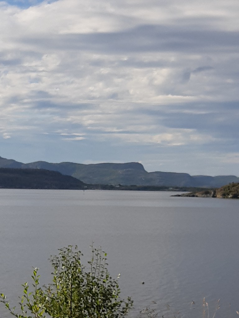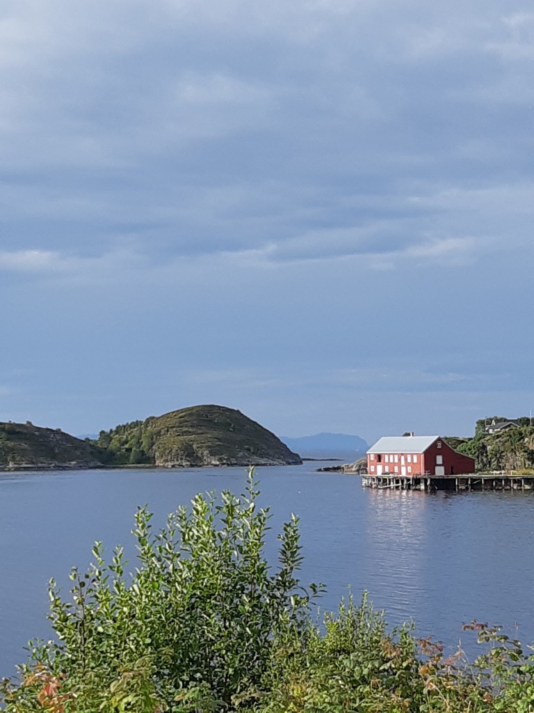 Pünktlichst war ich dort! Das Auto war ein Peugeot als Werkstættenfahrzeug! Das heißt; drei Personensitze in einer Reihe und danach die Trennwand zum Laderaum. Auch gut! Ich machte meinen Sitz zurecht, schnallte mich an und warf einen Blick in den Rückspiegel!😳 Hopla! Da ist ja alles schwarz! Ich ruckte an dem Rückspiegel herum – bis ich ihn in der Hand hatte! Nein – auch das noch!! Darunter war der “normale” Rückspiegel. Na also! Warum nicht gleich! Aber – da sah ich nur die Trennwand!! Na klar!!! Ich konnte ja nicht nach hinten sehen!! Das war ein Lieferwagen! Jetzt mußte ich mich darauf einstellen, stets die beiden Außenspiegeln zu beachten! Tja, alles erlebt man irgendeinmal zum ersten Mal! Aber ok, Lektion gelernt, auf geht’s!👍😊 Ich wollte auf alle Fælle zuerst in Richtung Lachs fahren. Dort im der Næhe gab es zwei grøßere Inseln, die ich vor der Führung besuchen konnte: Stokkøya und Linesøya. Sie waren ganz draußen vor dem Festland, also Fosen. Pløtzlich war ich jedoch in Revsnes, wo die Lachszuchtführung war! Wie das? Naja,…jetzt wußte ich zumindest, wo das Ziel war. Hier leuchtete zwischen saftigem Grün ein roter Kirchturm hervor. Ich parkte das Auto und ging eine schmale Straße den Hügel hinan.