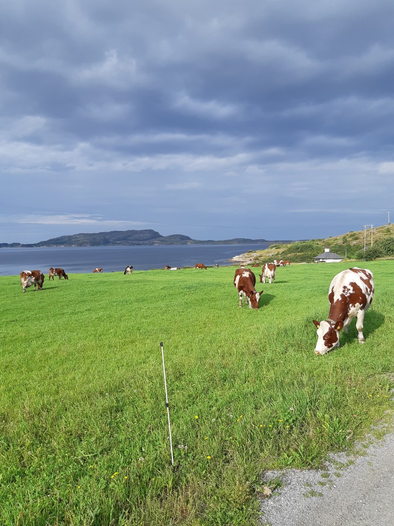 Nun mußte ich zurück, um die Lachszucht zu sehen. – Dazu kommt extra ein Beitrag. Ich überspringe somit und wende mich dem zweiten Hauptthema zu, den Lauvøya. Sie liegen nahe Åfjord, meinem Ausgangspunkt. Wæhrend die beschriebenen Inseln felsig und mæchtig dastanden, war Lauvøya flaches Grasland, mit ganz geringen Erhebungen. Die anderen Inseln “trotzten” dem Meer, dem Wetter, wæhrend hier Lauvøya hingebungsvoll Sonnenschein, Nebel und Regen in sich aufnahm. Es war wie Yin (Lauvøya) und Yang (Stokkøya und Linesøya). Vereinzelt standen alte Bauernhæuser, doch gab es eine Anzahl eleganter Ferienvillen. Dies schien ein Rückziehort betuchter Herrschaften zu sein.