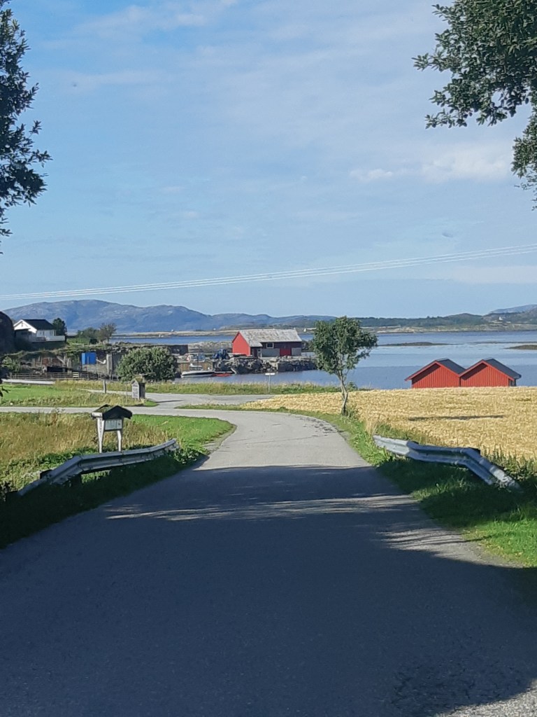 Revsnes gab den Anschein eines Industrieortes – fast ungewohnt! Ich kehrte zum Auto zurück und fuhr nun zu den Inseln. Die grøßere Insel ist Stokkøya. Die Straße wand sich entlang dem Wasser. Bunte, kleinere æltere Bauernhæuser standen unterbrochen von mehreren Wochenenddomizilien und grüßten den Vorbeikommenden.Immer weiter hinaus zog und wand sich die Straße, hatte unerwartete Kurven, die wieder eine ganz andere Landschaft zeigten!