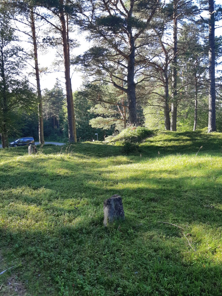 Auf der Rückfahrt von dieser Insel kam ich an einem geschichtlichen Ort vorbei: Dragseide. Einerseits ist es eine Landenge, die zwei Fjorde voneinader trennt. In alten Zeiten, so las ich, hievte man Boote und Segelschiffe hoch und brachte sie über die Landesenge zum gegenüberliwgenden Fjord, um die Fahrt fortzusetzen. – Umgekehrt als heute, wo man die Fahrzeuge vom Land auf eine Fæhre bringt, um sie am gegenüberliegenden Land wieder in Bewegung zu setzen. Die zweite geschichtliche Aufmerksamkeit gilt einer alten Begrabungsstætte, die im 19. Jahrhundert wiederentdeckt wurde, um dann im 20. Jahrhundert archæologisch untersucht und geschützt zu werden. Es sind Steinsæulen, aber auch længere und kürzere Grabhügel, die gut erkennbar sind. Man nimmt an, daß dieser Ort seit 600 v C. bis 1000 n.C. zur Grablegung genutzt wurde. Dragseide war durch viele Jahrhunderte hindurch ein wichtiger Verbindungsort und Handelsplatz.