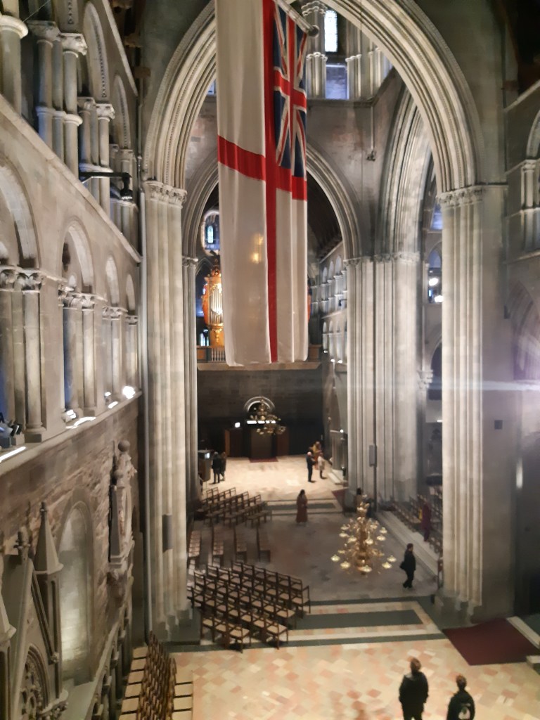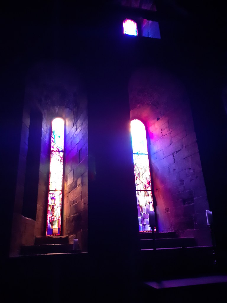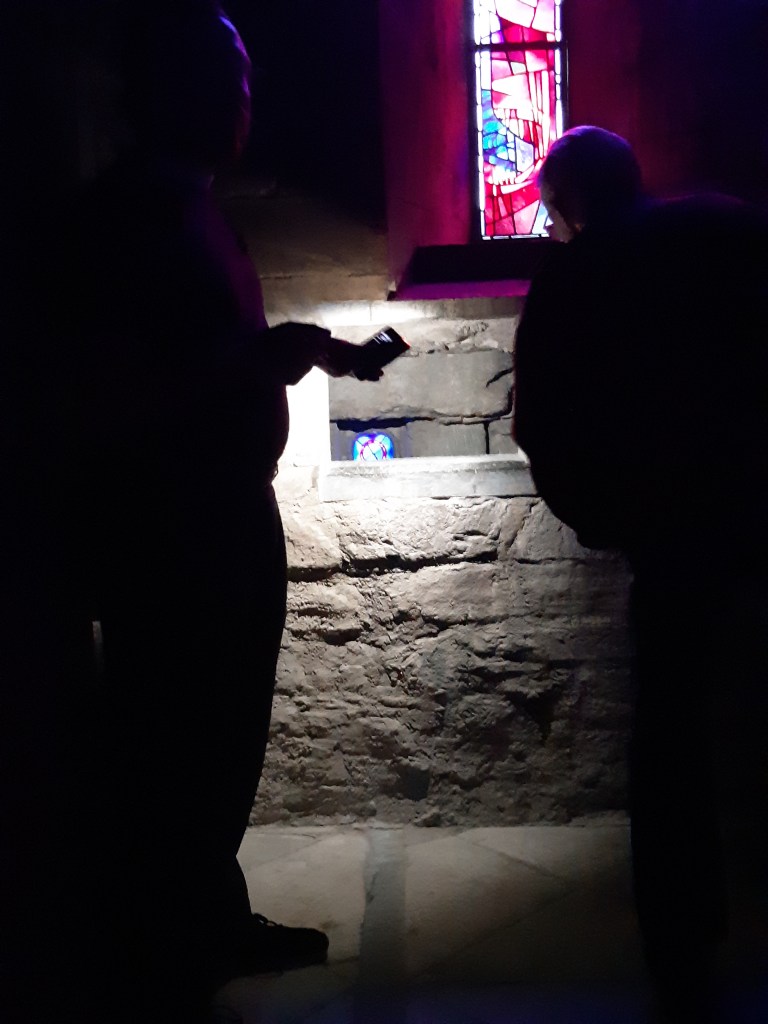 Ich hatte also das Programm “geheime Ræume der Kathedrale” gebucht, wie auch eine geführte Besichtigungstour durch den Dom. Es war nur eine kleine Gruppe von maximal neun Personen zugelassen, und das als EINZIGE Besichtigung der Woche. Also “keine Fließbandbesichtigungen” hier! Wir gingen vom Pilgertreffpunkt außerhalb der Kirche in die Kathedrale. Der Führer machte uns darauf aufmerksam, dass es hohe Stufen sind und dunkle Ræume. So verschwanden wir durch eine kleine niedrige Tür … Der Gang war dunkel, ganz eng und die Stufen mußte man sachte hinansteigen, bis wir in einen kleinen Raum gelangten: die Marienkapelle. Sie war schmucklos, abgesehen von den præchtigen Glasfenstern, die erst im letzten Drittel des 20. Jahrhunderts neu eingesetzt worden waren. Hier waren Messen gelesen worden und es gab zusætzlich zwei kleine Zellen, wo man die Leiden in der einen und die Freuden Marias in der anderen Zelle nachfühlen konnte und darüber meditieren.