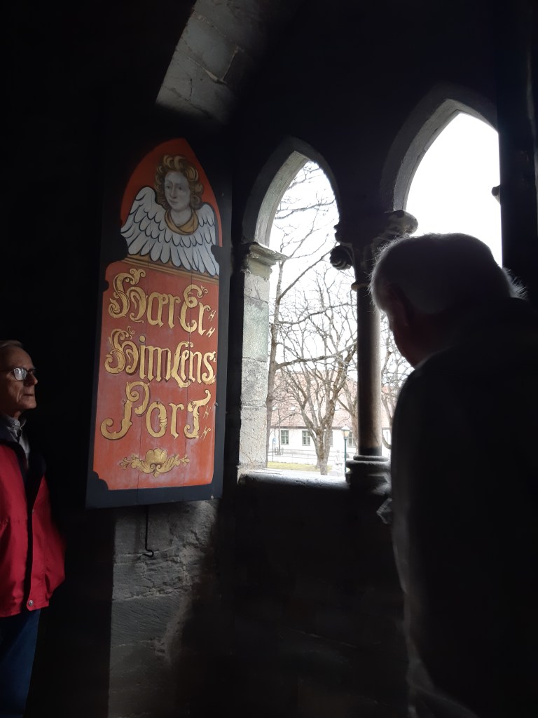 Danach gingen wir einen anderen, ganz schmalen Gang entlang, eng, kalt, enterisch …und gelangten zu einem æhnlichen Raum: dunkel, “un-heilig”. Doch siehe da: hier konnte man Fensterlæden øffnen! Man nimmt an, dass dieser Raum dazu diente, zum Volk unter sich zu sprechen, oder zu predigen. Der Blick geht auf die Allee, die zum früheren Anlegeplatz führte, wo die zu krønenden Kønige mit dem Schiff ankamen.